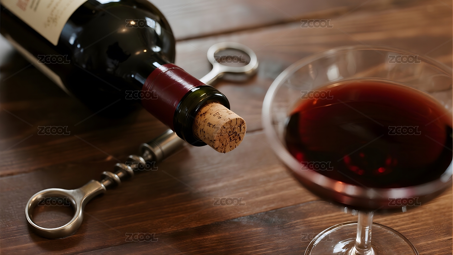 红酒瓶与酒杯静置木桌