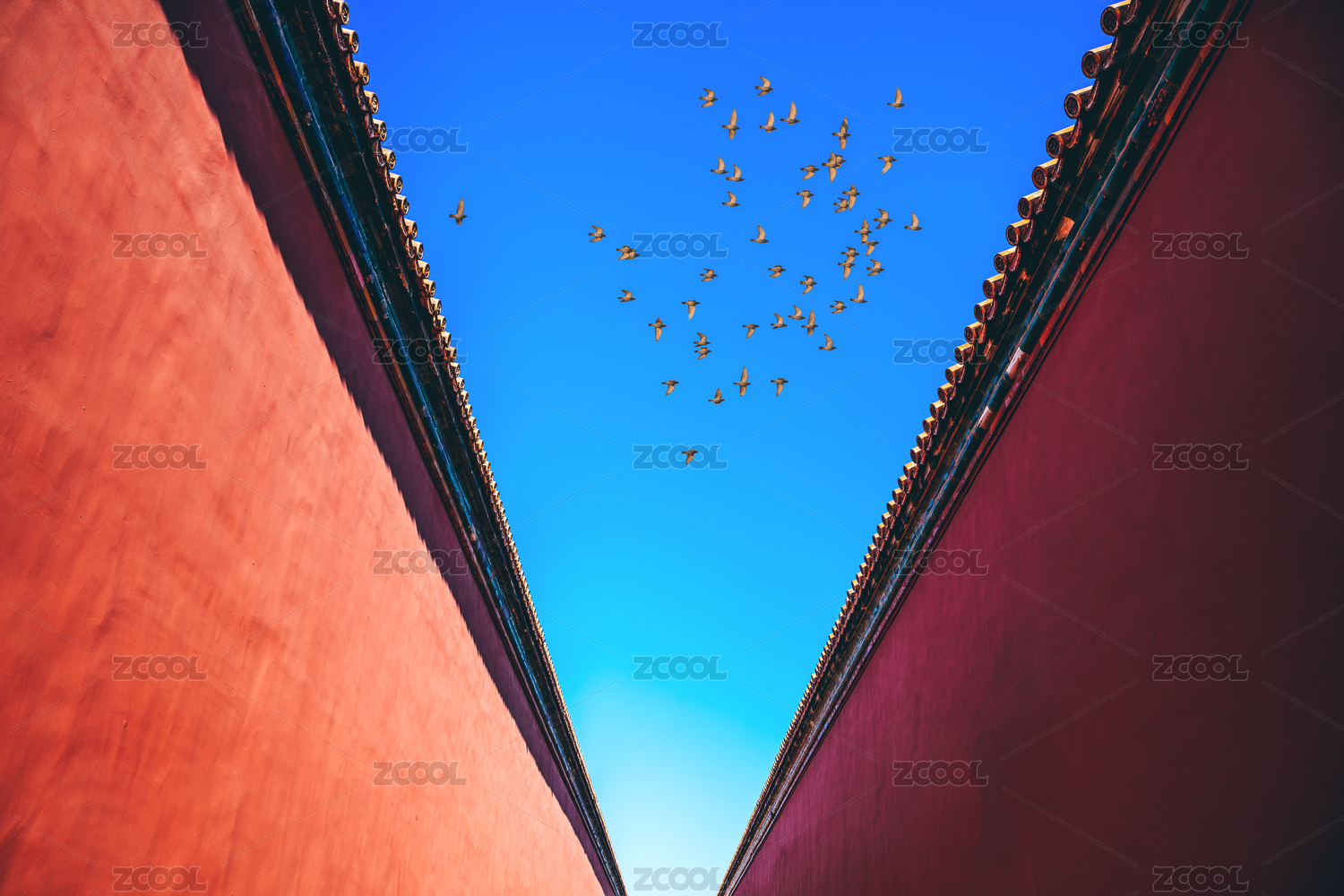 中国北京故宫的鸽子午门前的鸽子展翅飞翔
