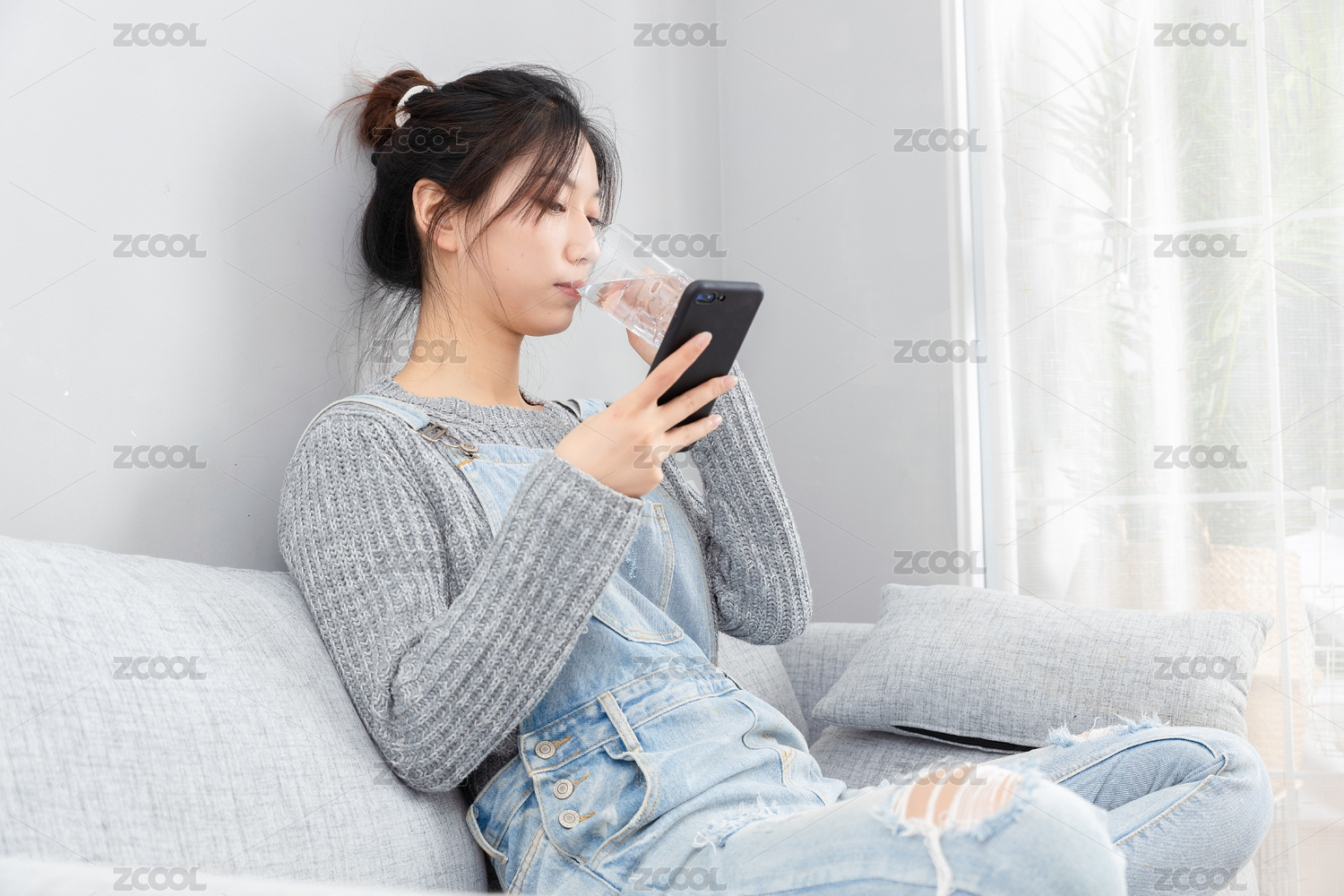 坐在沙发上边喝水边看平板电脑的亚洲女孩