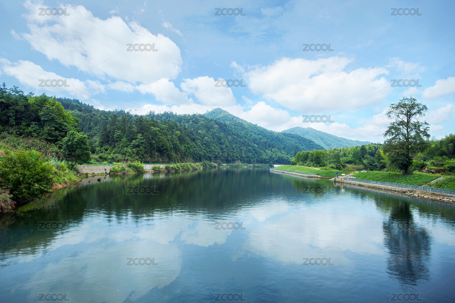 中国江西景德镇蓝天白云下昌江源头沿岸山水风光