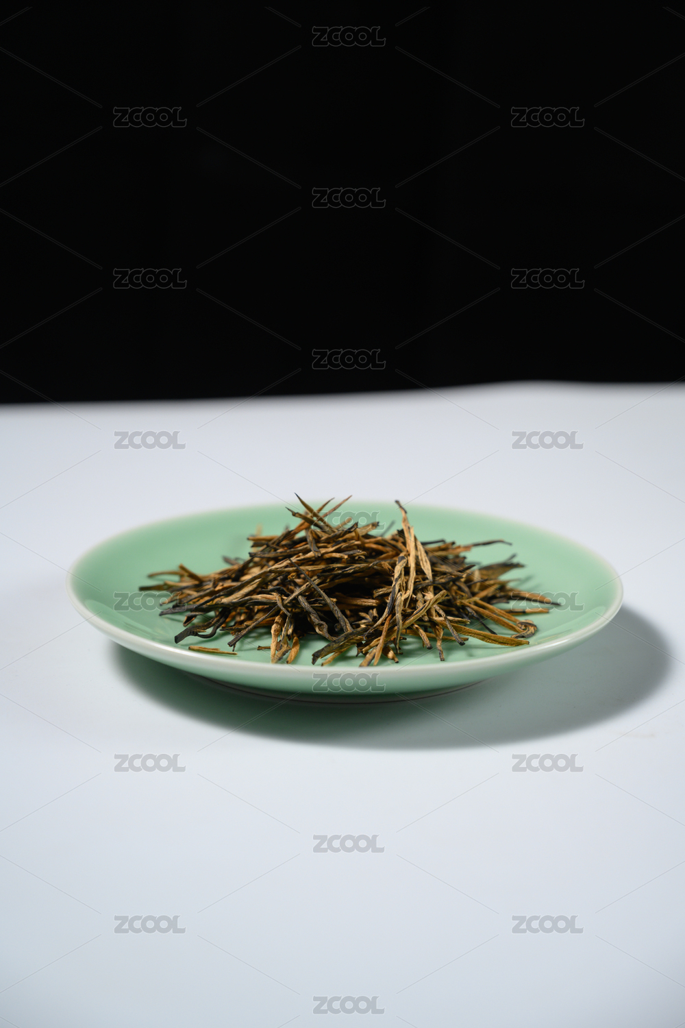 桌面上的盘子里的干爽切香气四溢的滇红金针