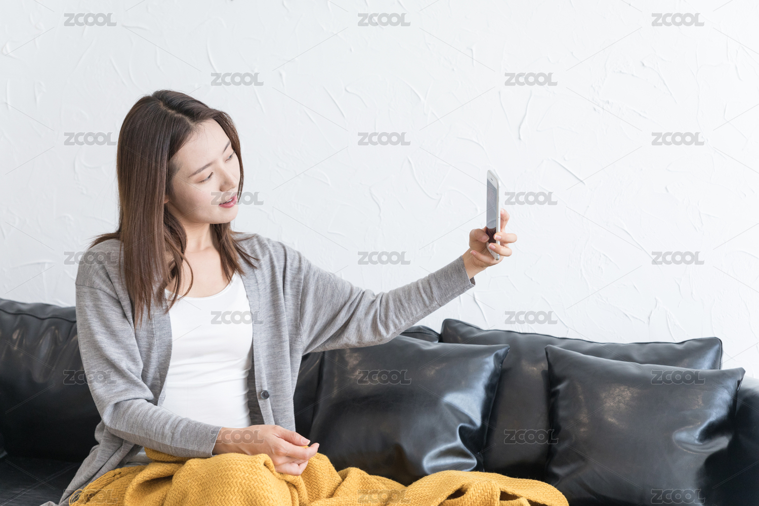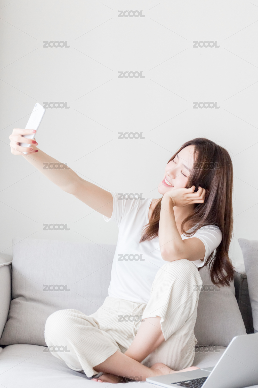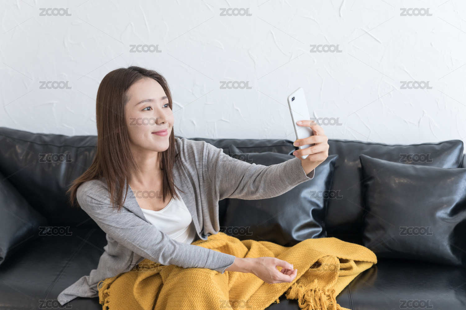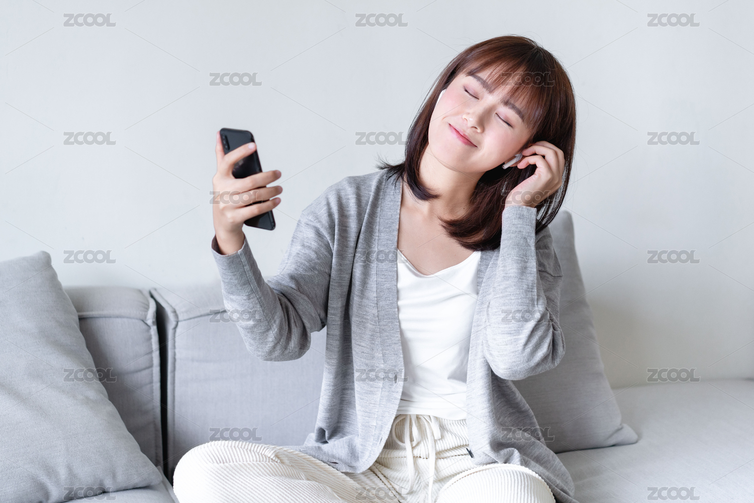 年轻女性坐在沙发上一边拿着手机一边听音乐