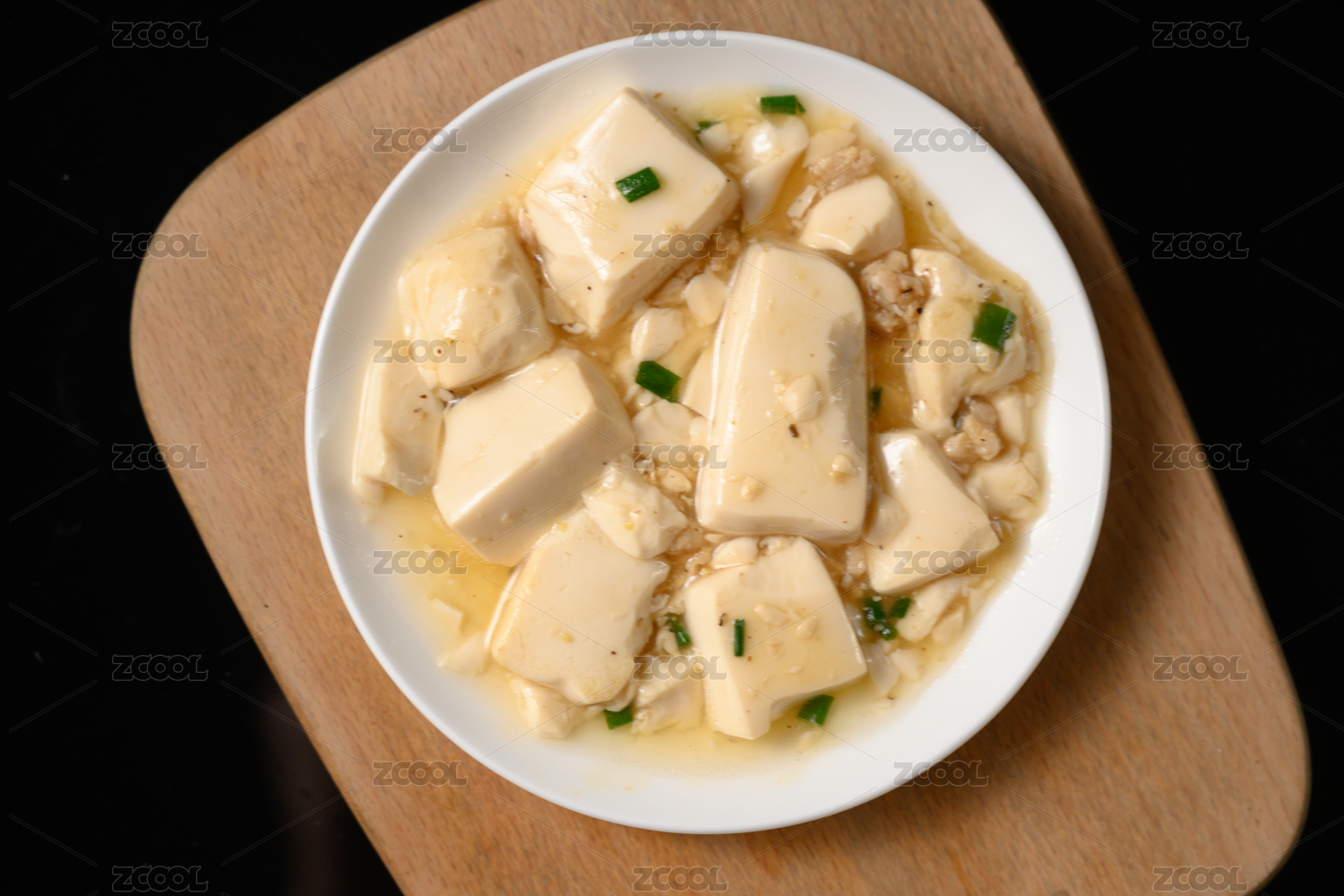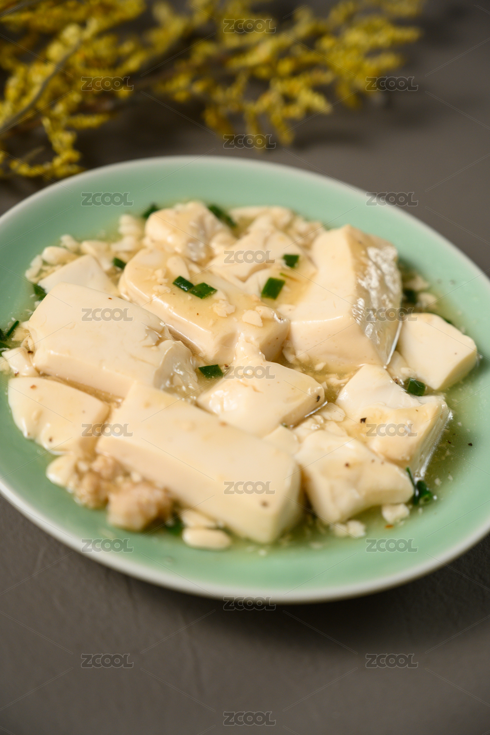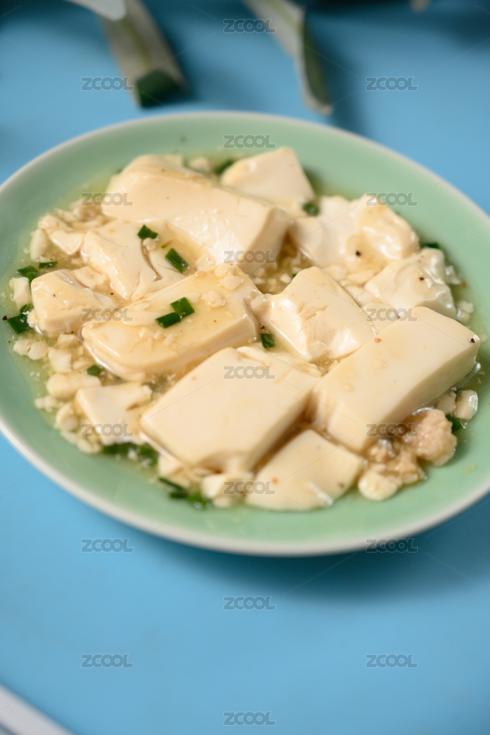 桌面上的盘子里的美味可口的小葱拌豆腐