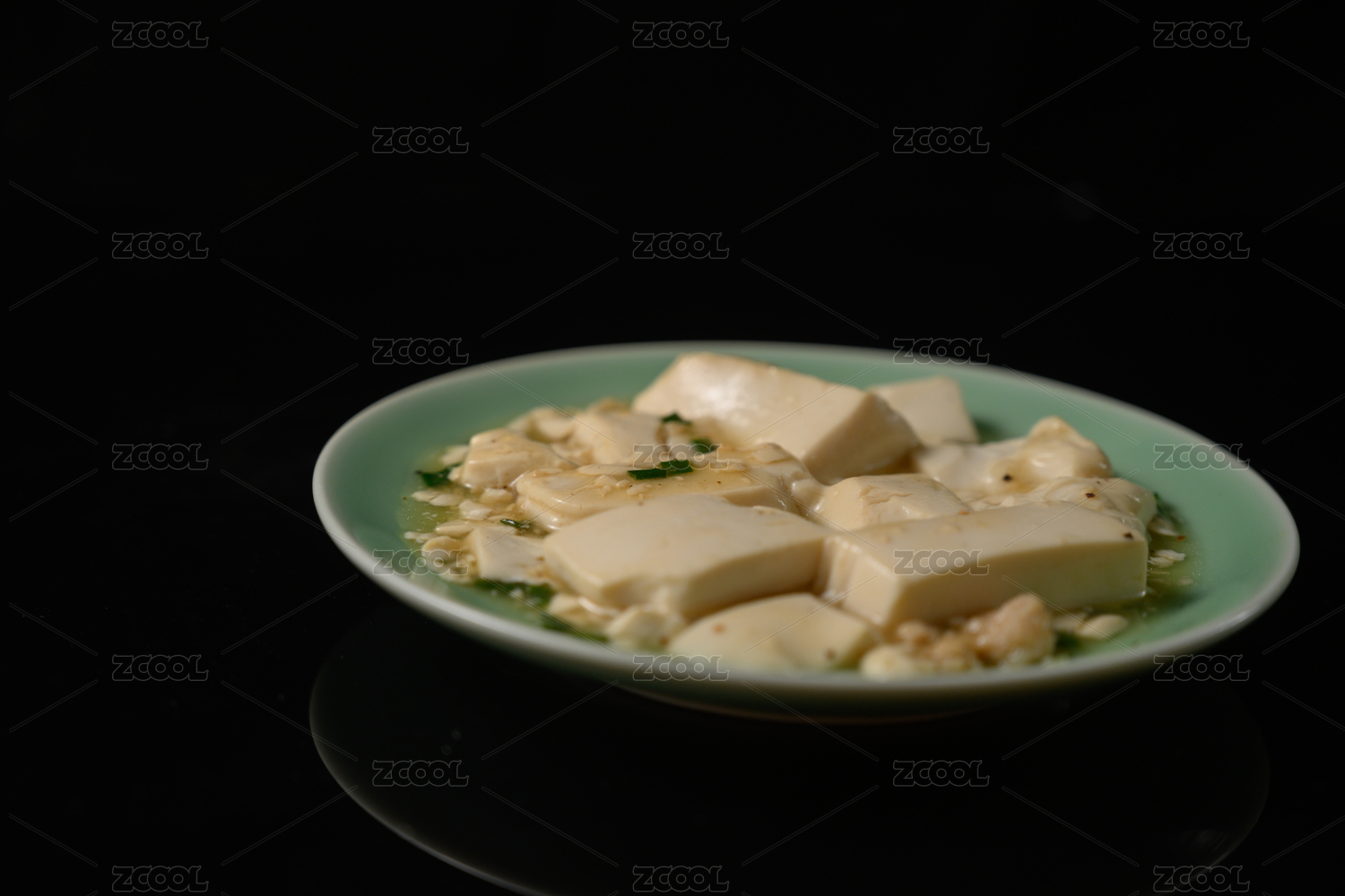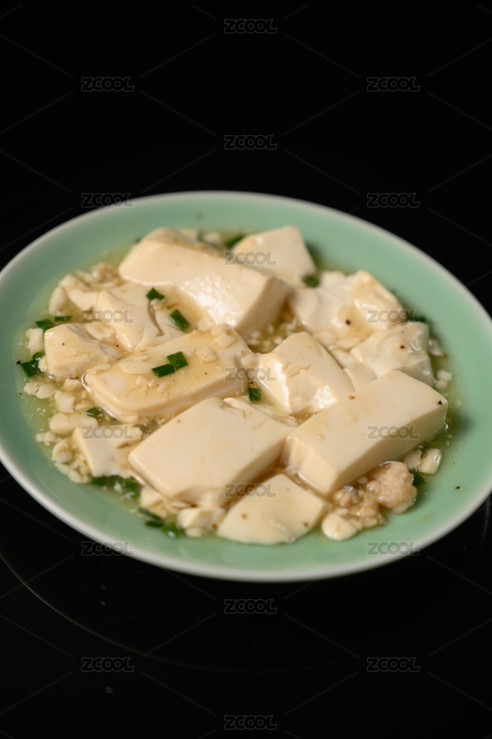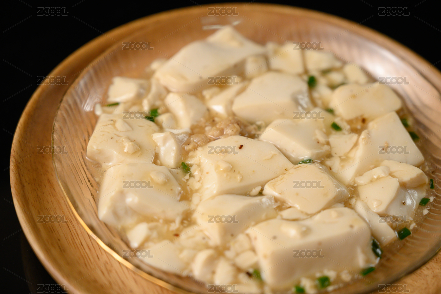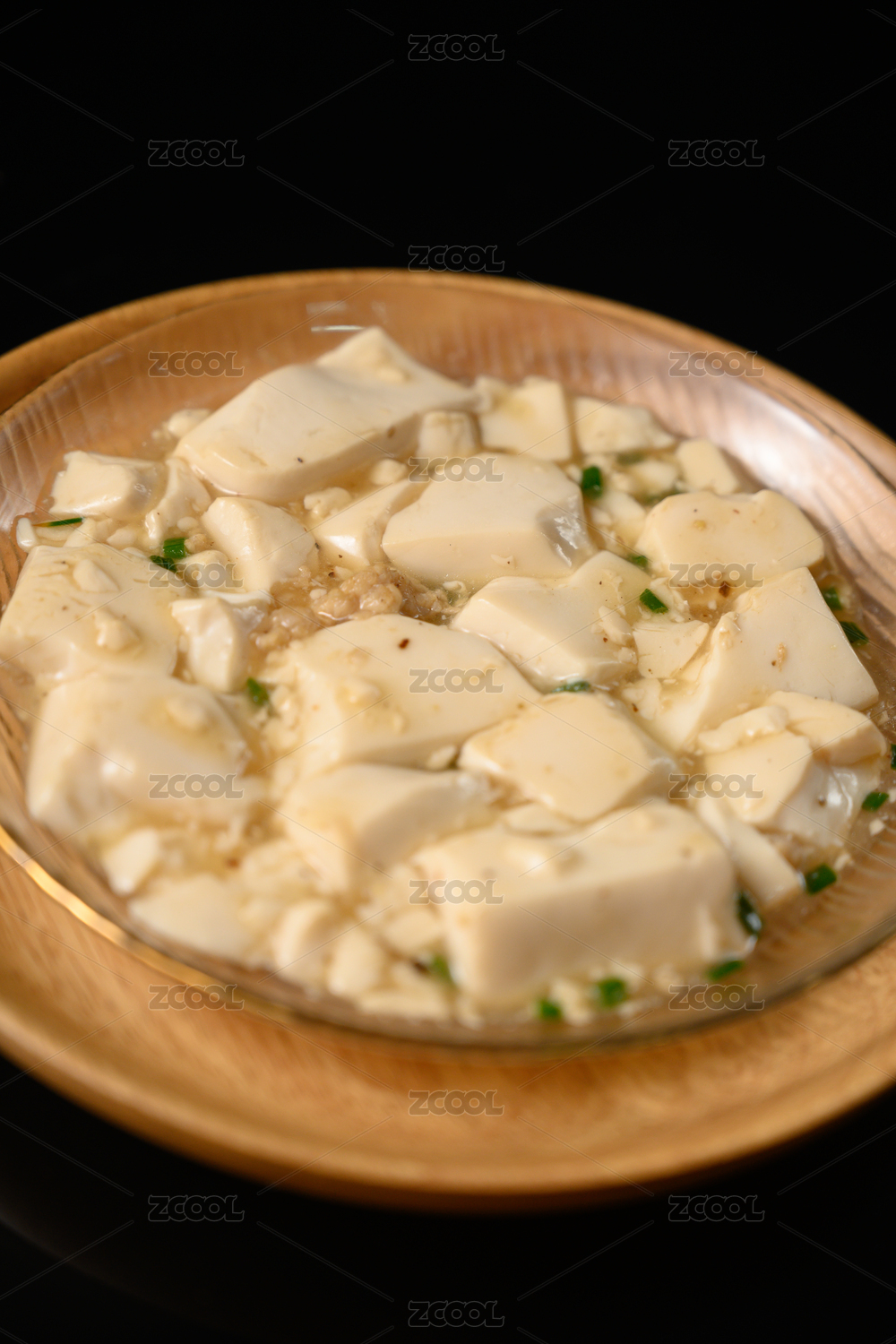 桌面上的盘子里的美味可口的小葱拌豆腐