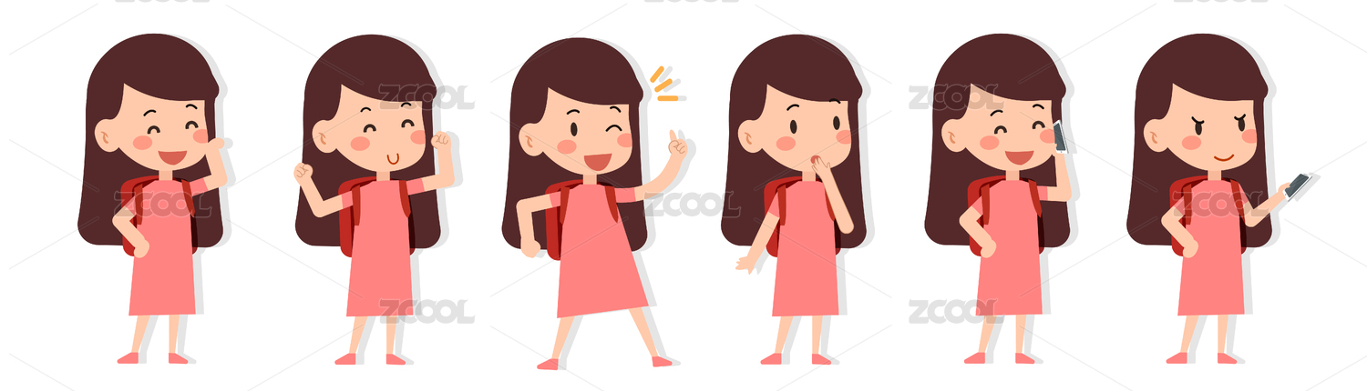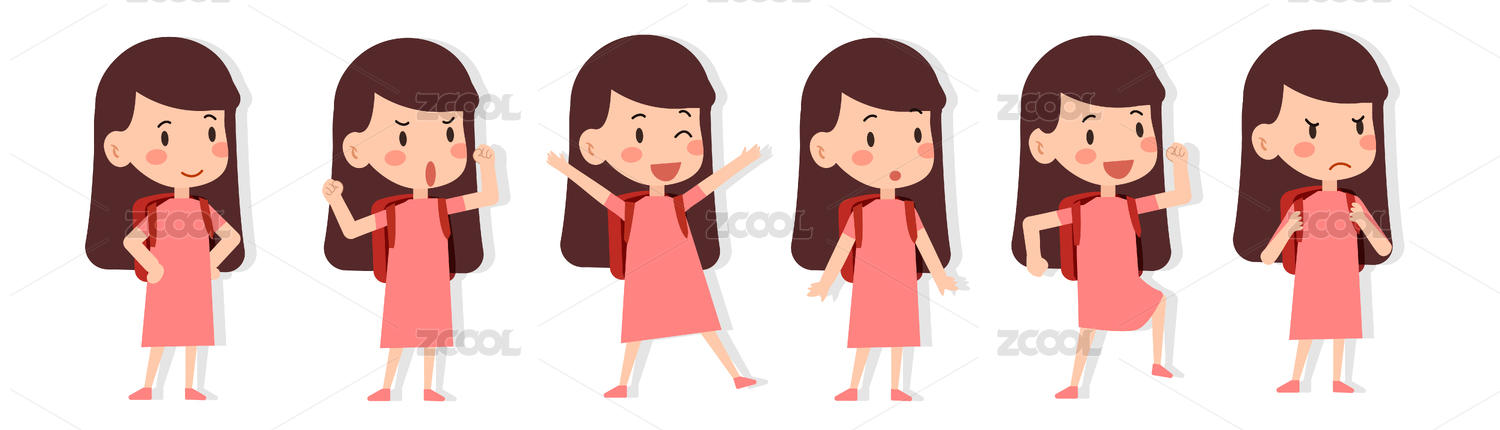 Dynamic Cartoon Vector Map of Cute Long Hair Girl with Backpack背书包可爱长发女孩动态卡通矢量图