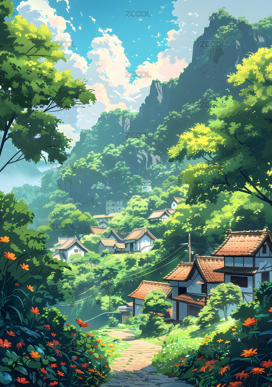 幽静绿色茂密森林中的清澈小溪插画绘画
