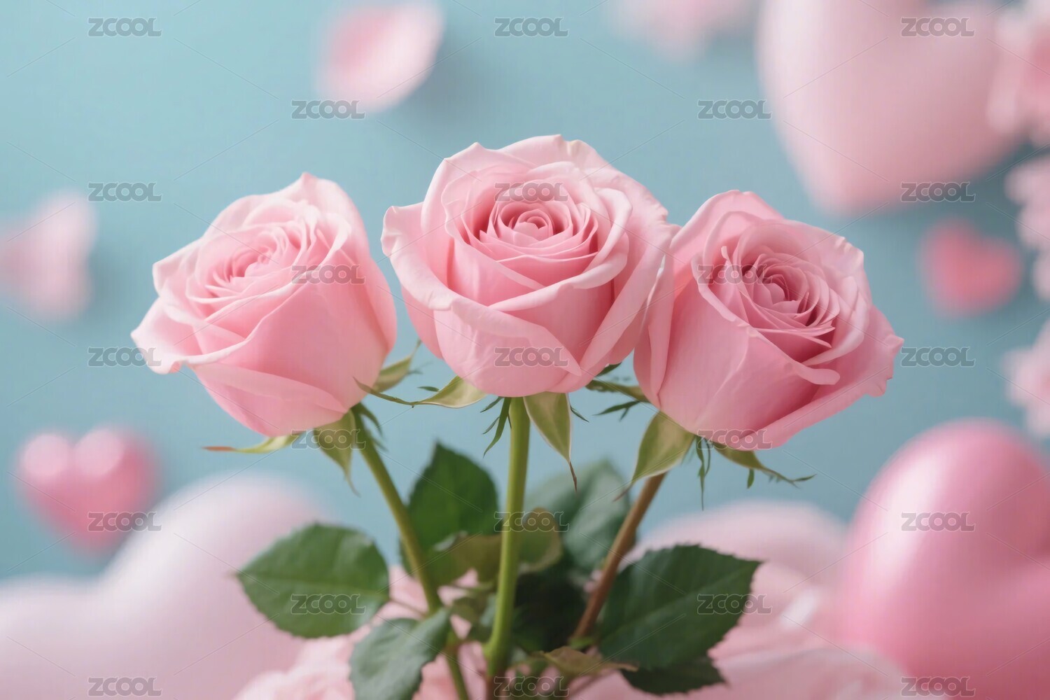 放在白色背景上的三支红色玫瑰花及两个心型装饰特写