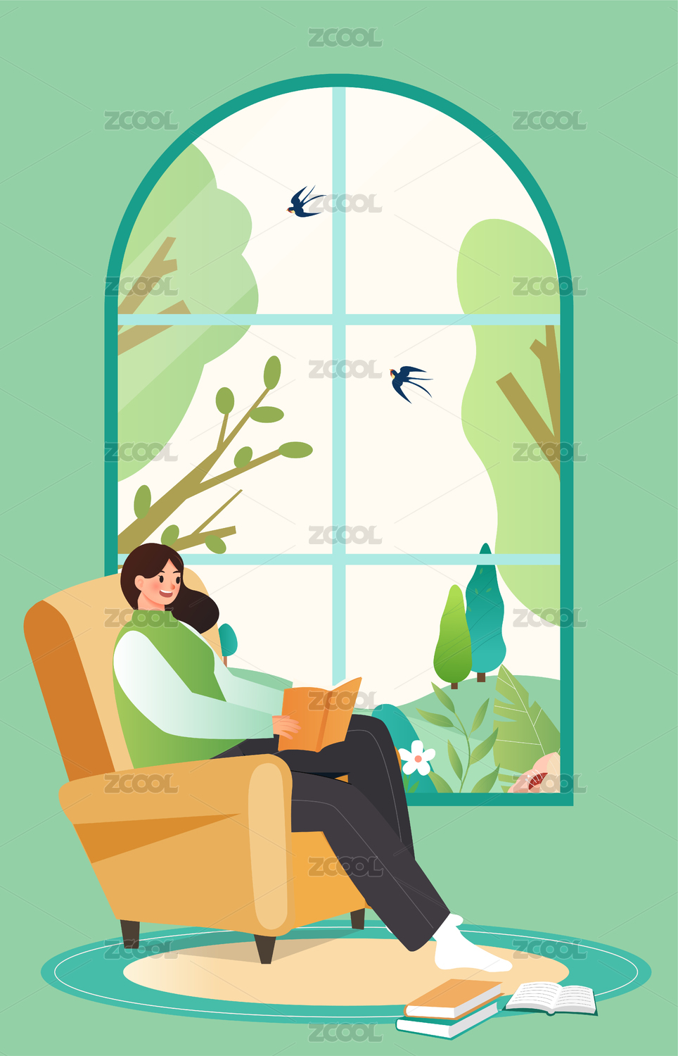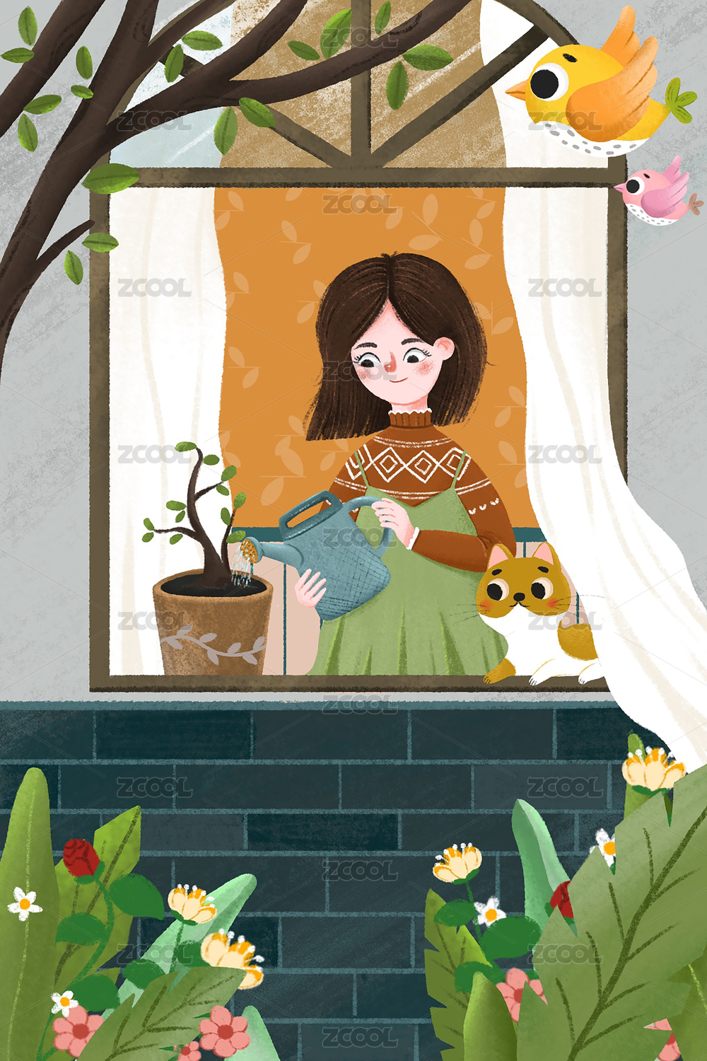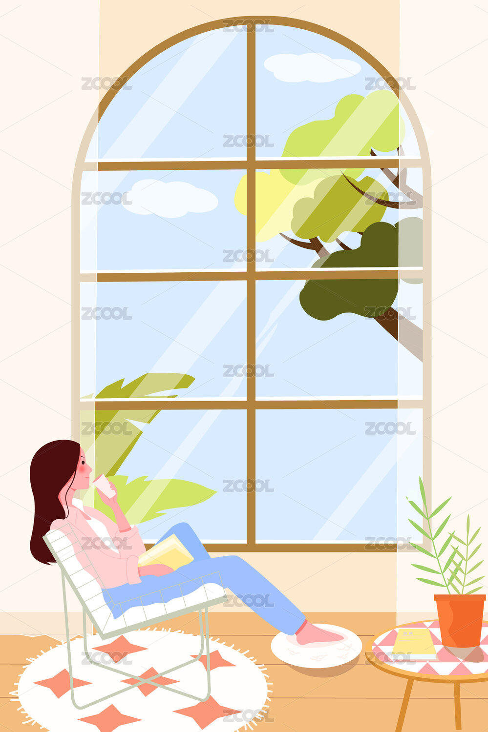 夏天女孩靠在窗边窗外大树草丛风景插画