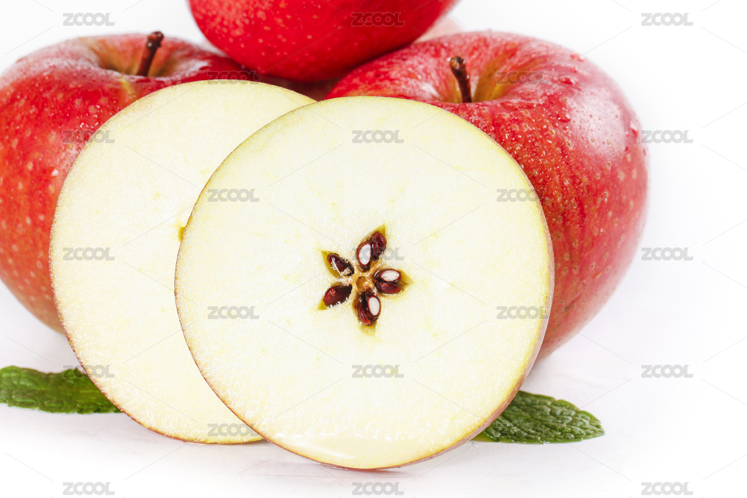白底上放着新鲜秦冠丑苹果和苹果果肉