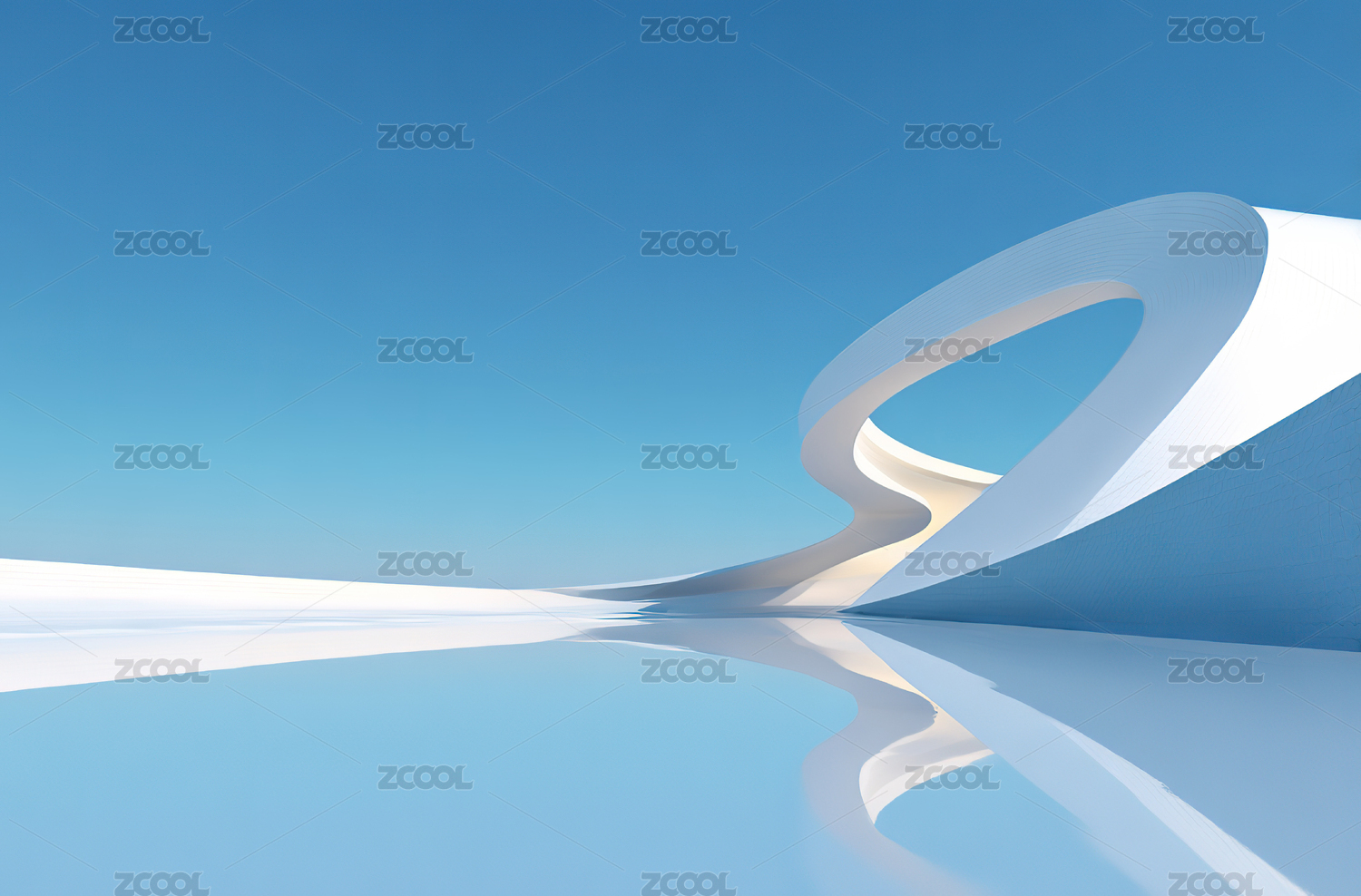 无人广场白色弯曲弧形建筑与倒影有天空背景