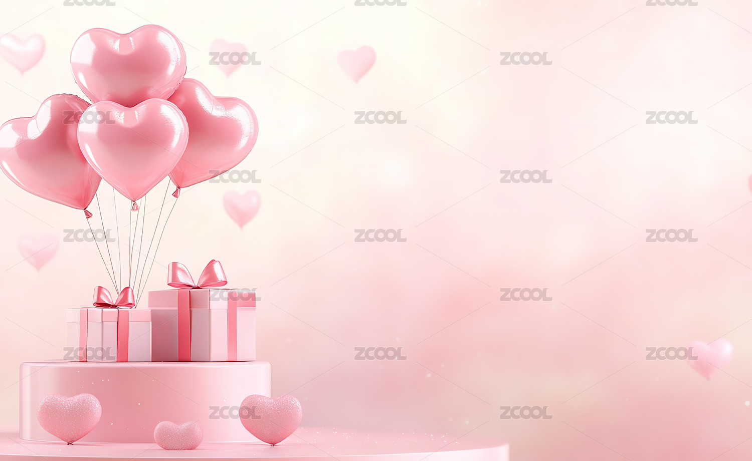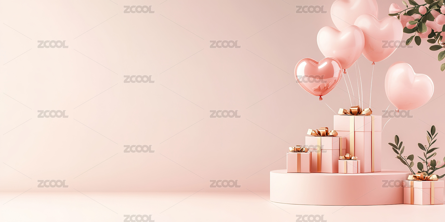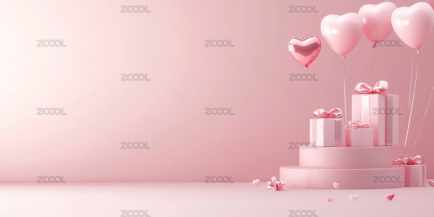 粉色背景前的礼物盒和心形气球装饰