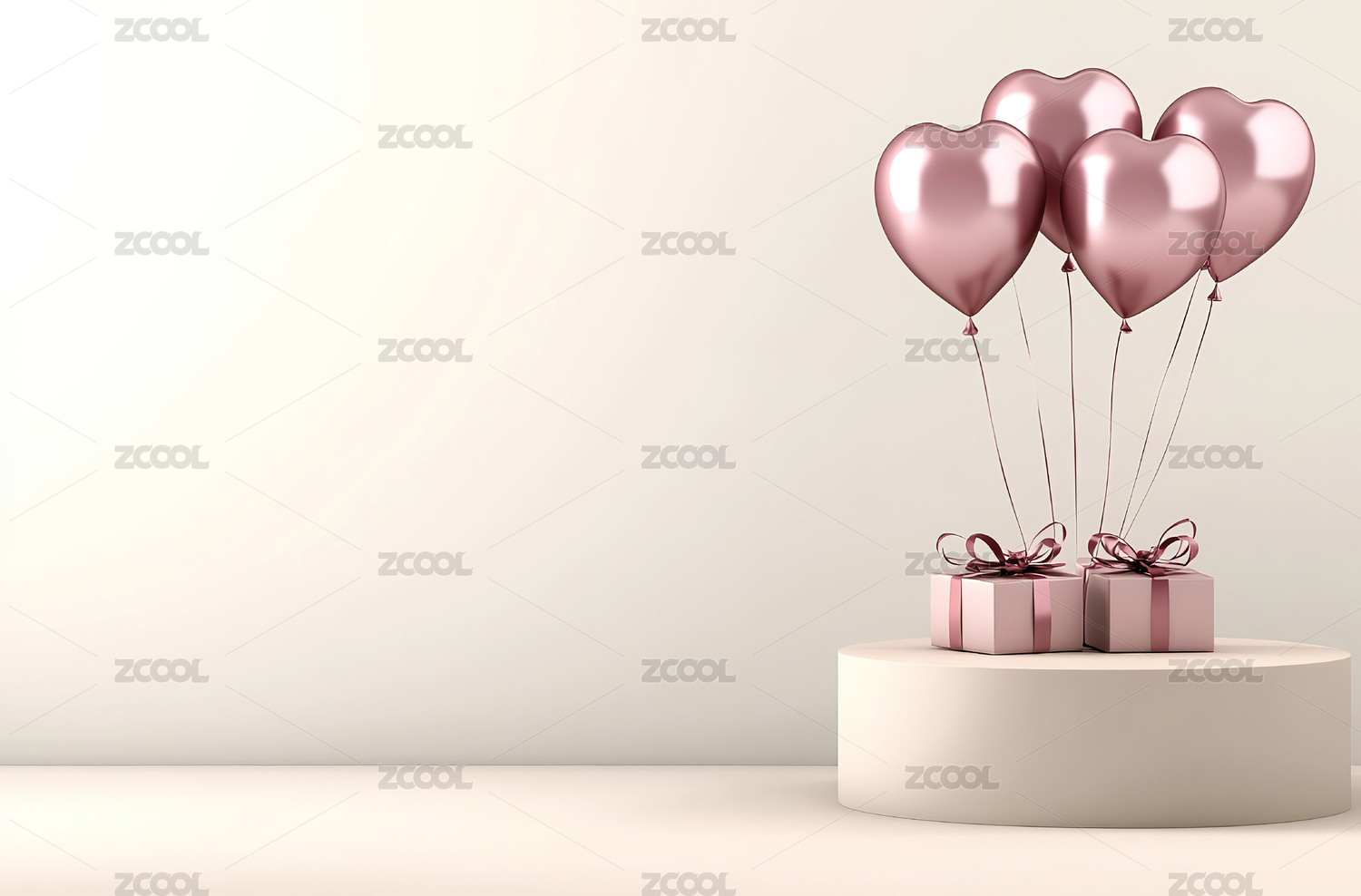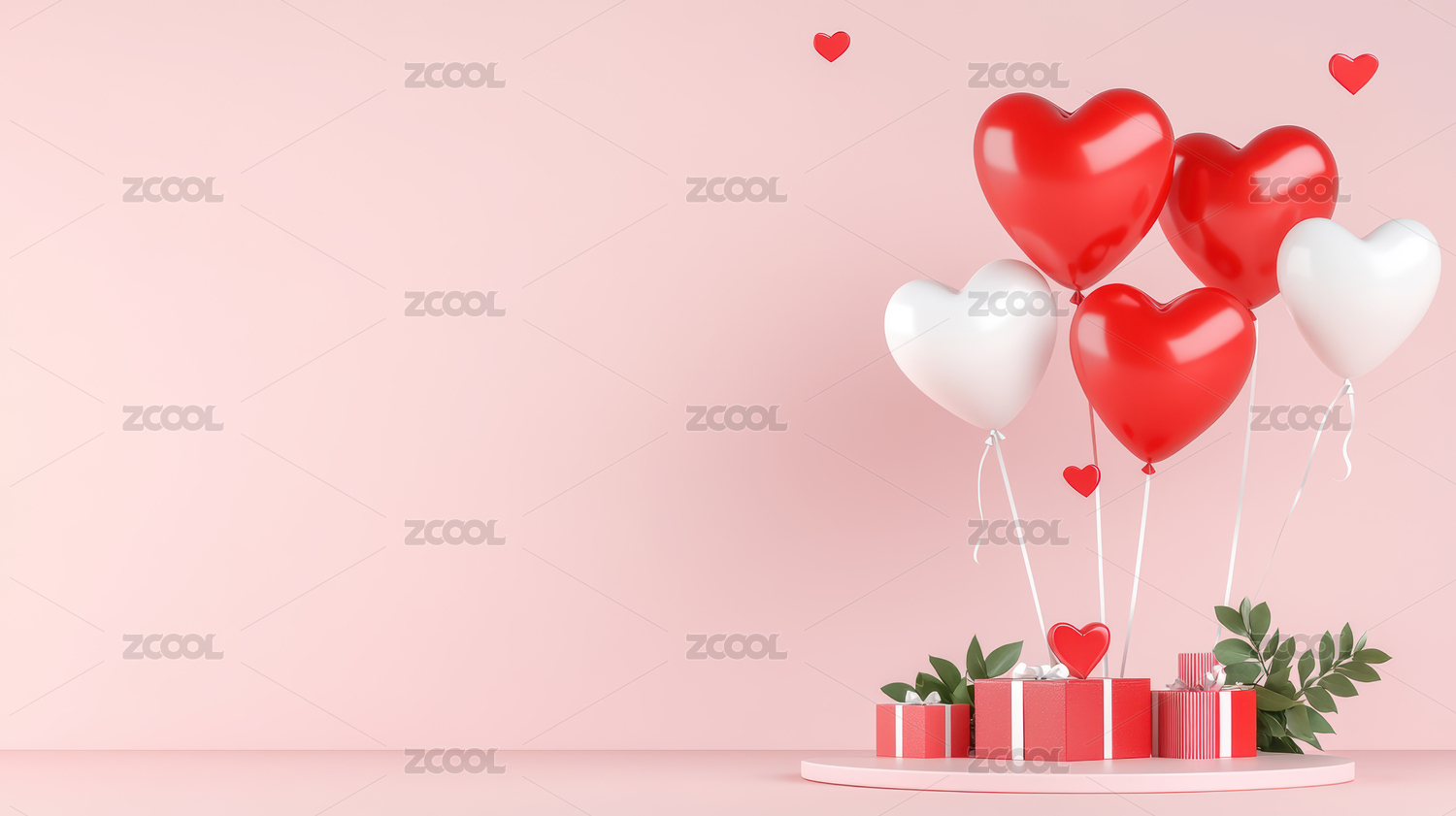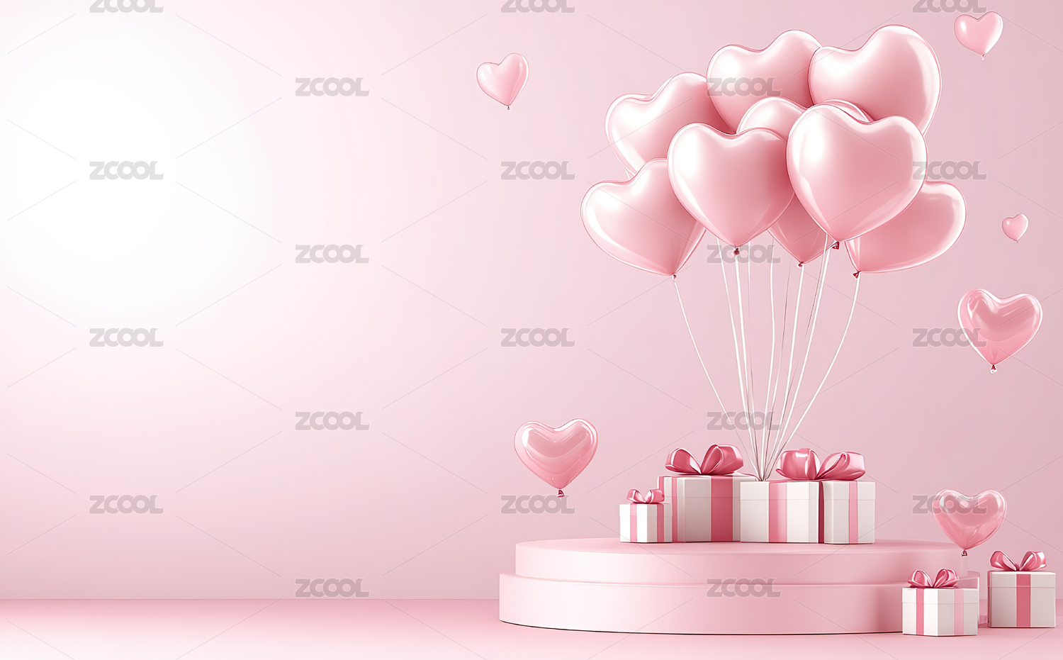 粉色背景前的礼物盒和心形气球装饰
