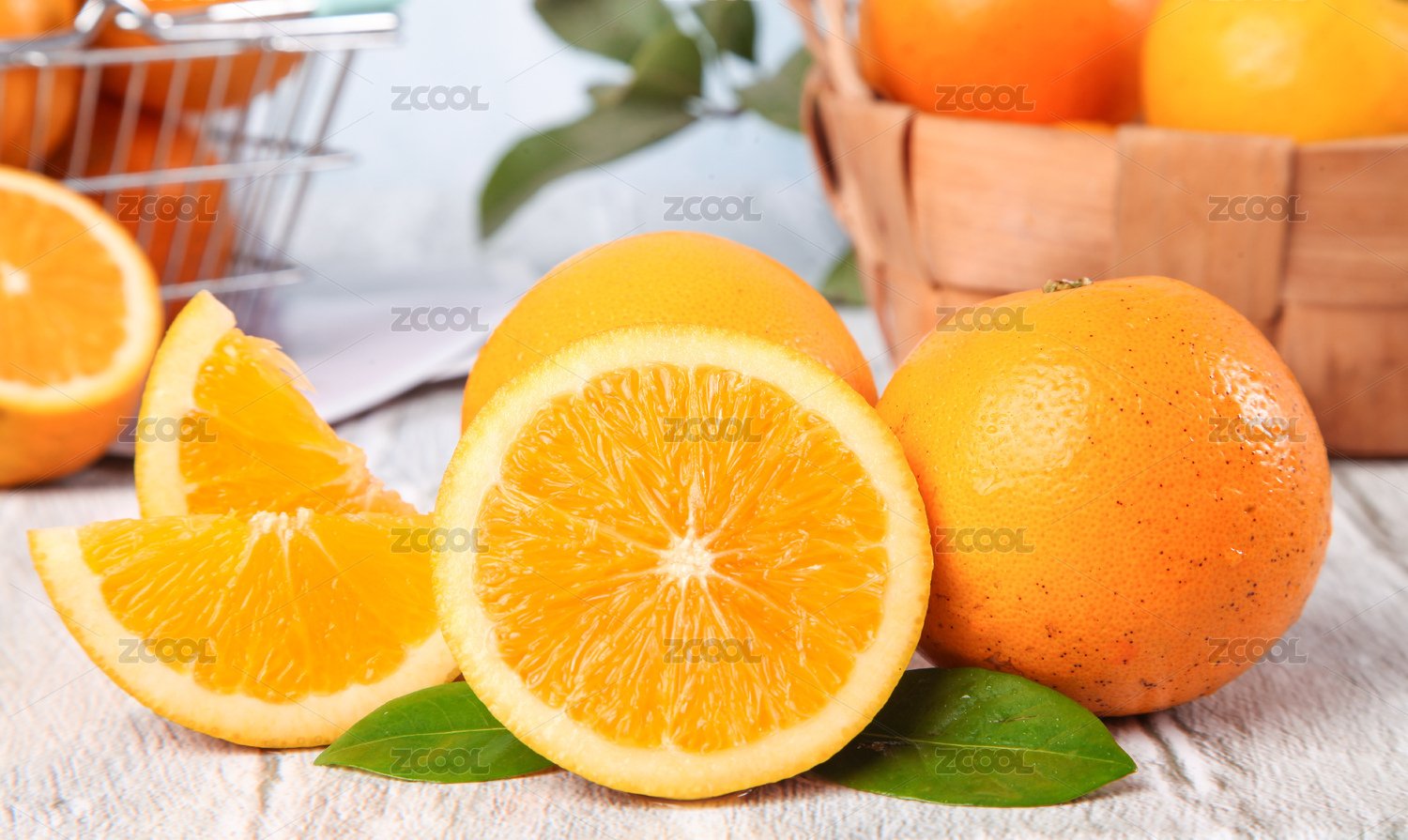 白木纹底上放着一堆湖南冰糖橙和切面的甜橙