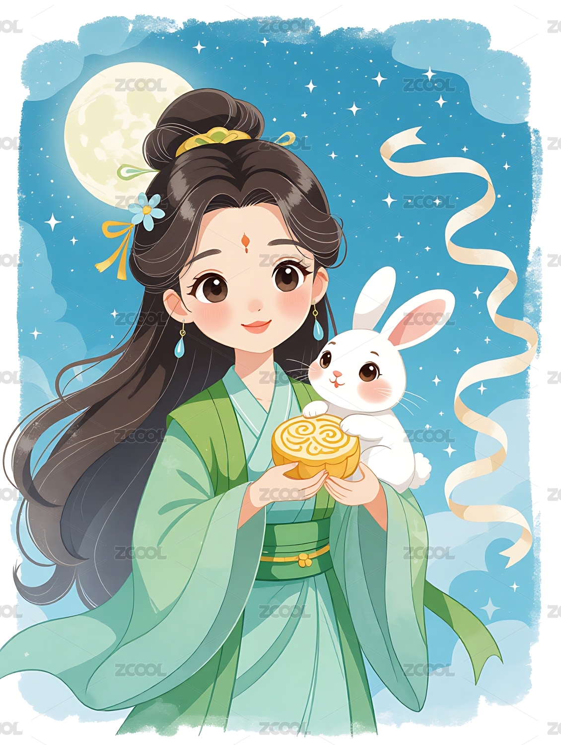 AIGC202407,美女,嫦娥,古风,中国风,人物,神话,兔子,可爱,插画
