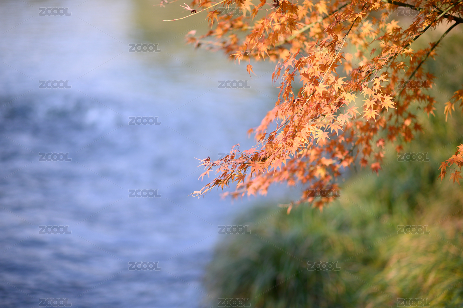 阳光下水边的秋叶