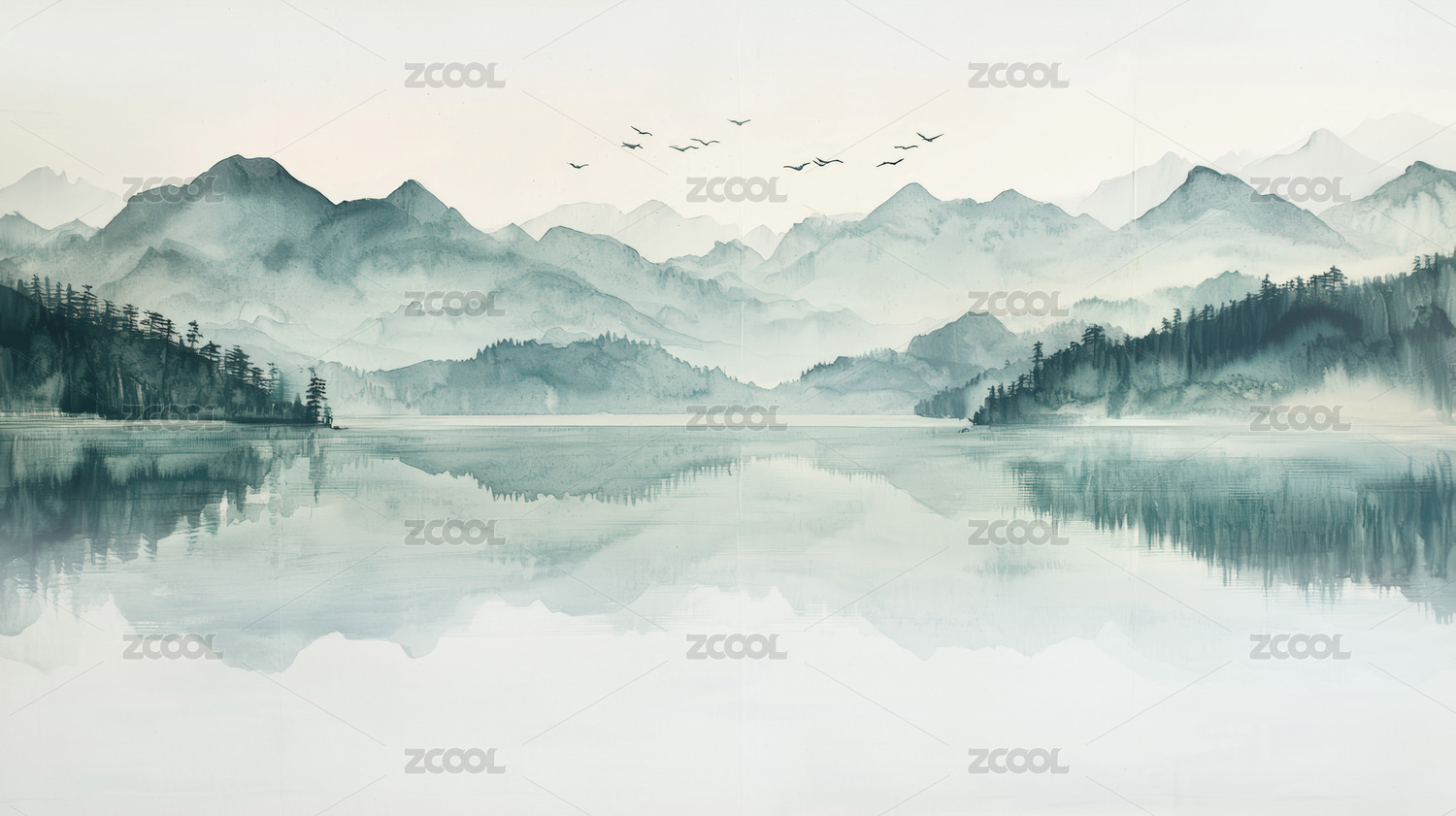 群山倒映湖面飞鸟翱翔的宁静画卷
