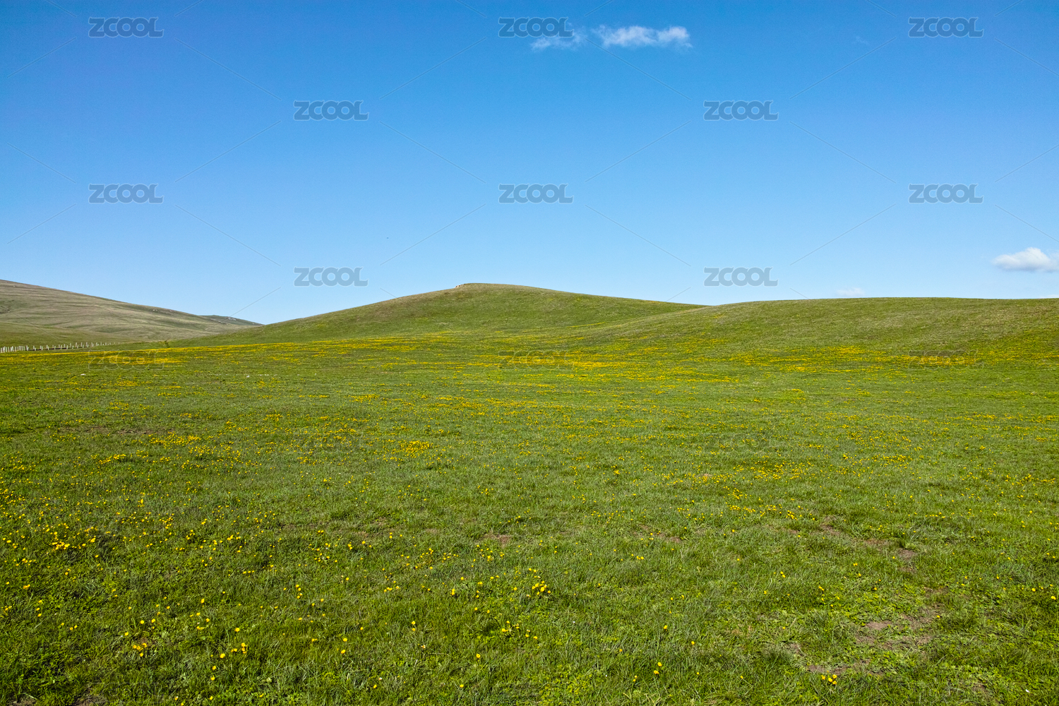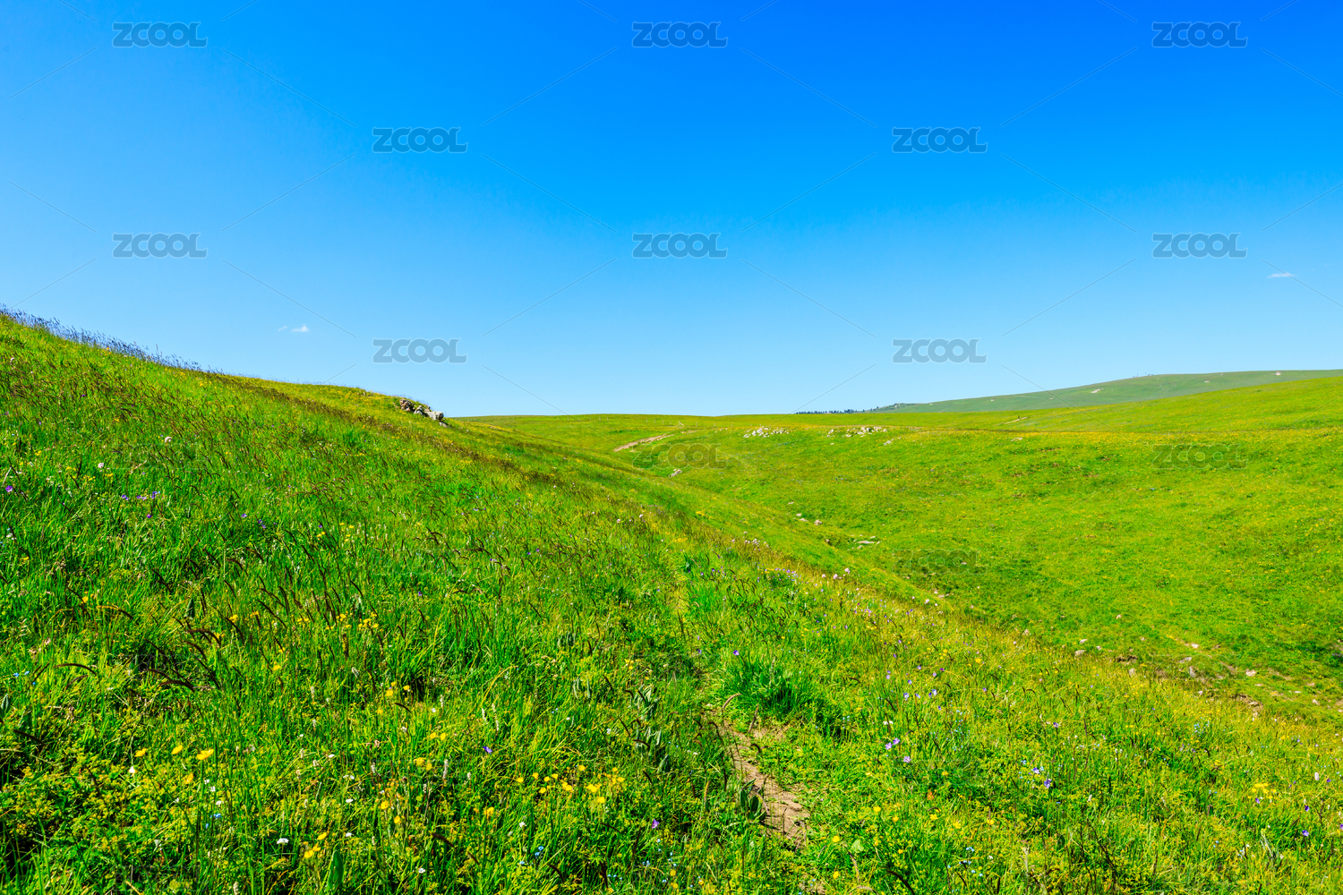 中国新疆夏季晴天蓝色天空下绿色的大草原