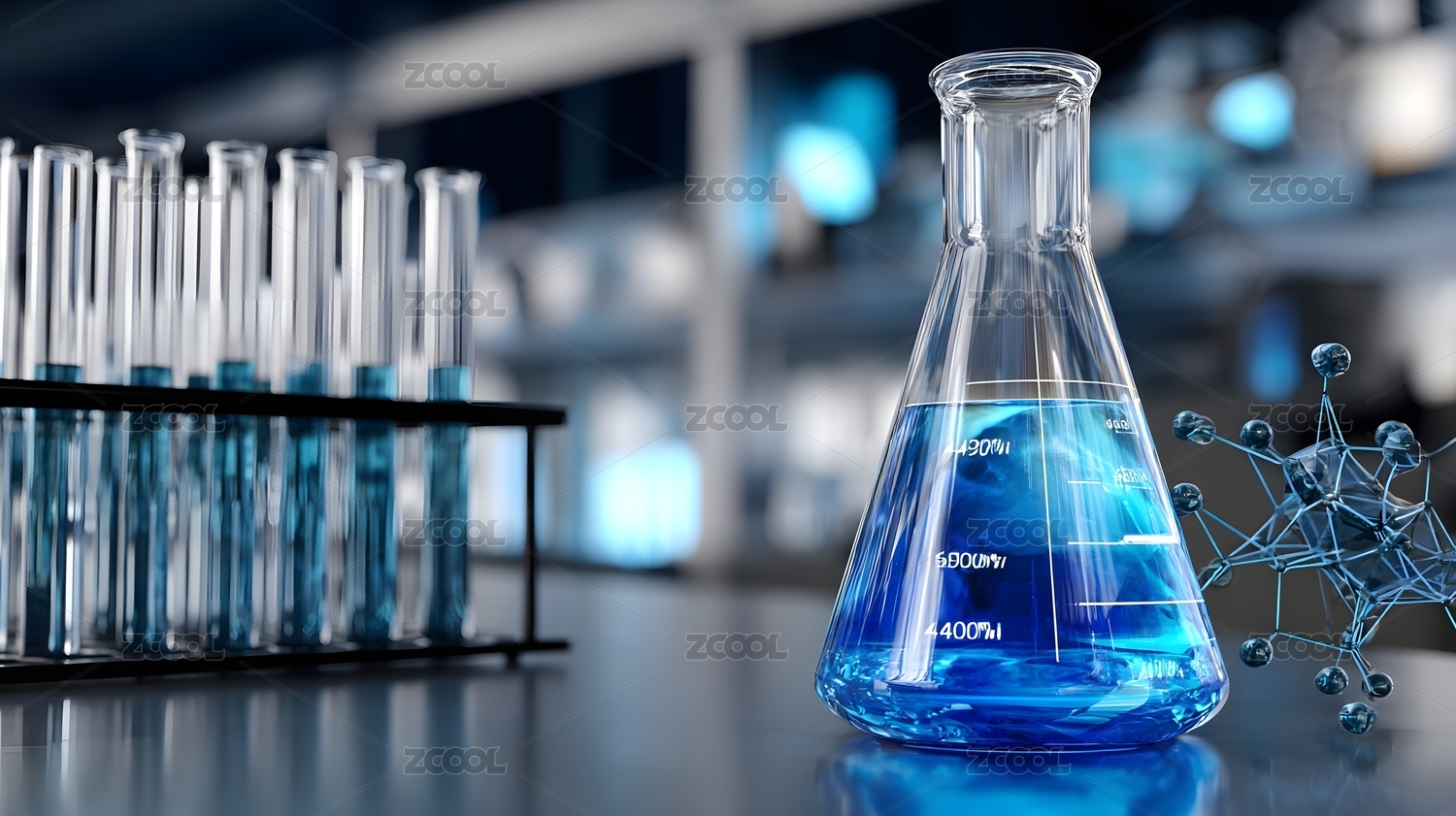 蓝色液体烧瓶与分子模型实验室场景