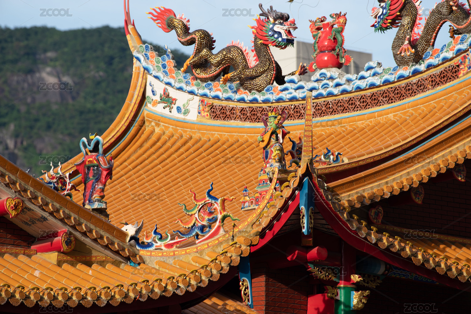 中国福州古建筑坡屋面顶的琉璃彩塑