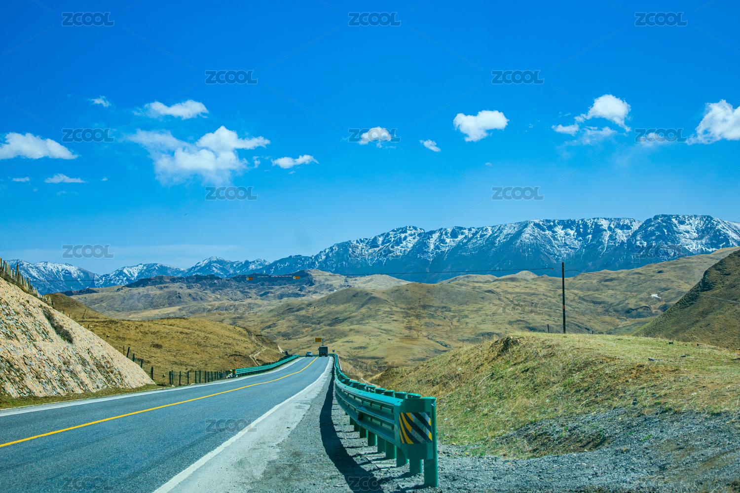 弯道,戈壁,高速公路,道路,山脉,山,护栏,晴天,蓝天,白云