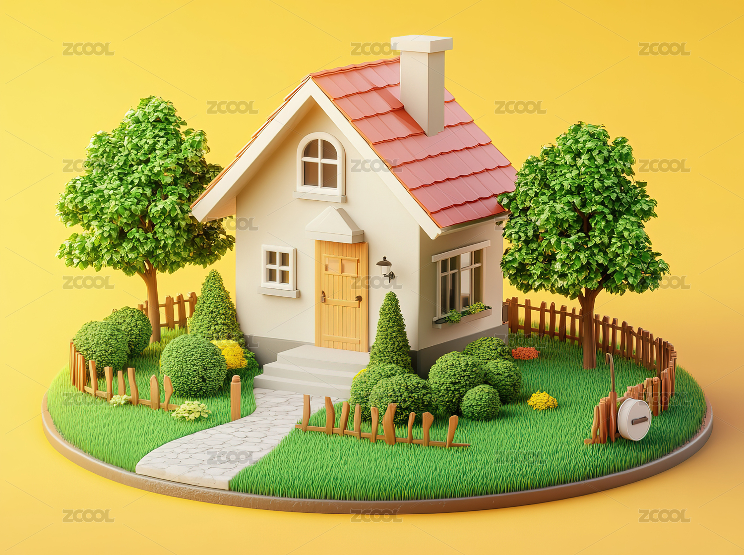 温馨的橙色小屋与绿树环绕