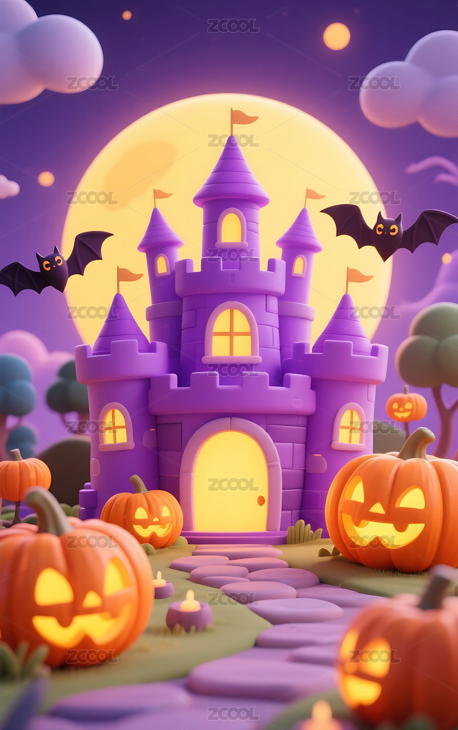 3D万圣节紫色城堡南瓜插画背景壁纸
