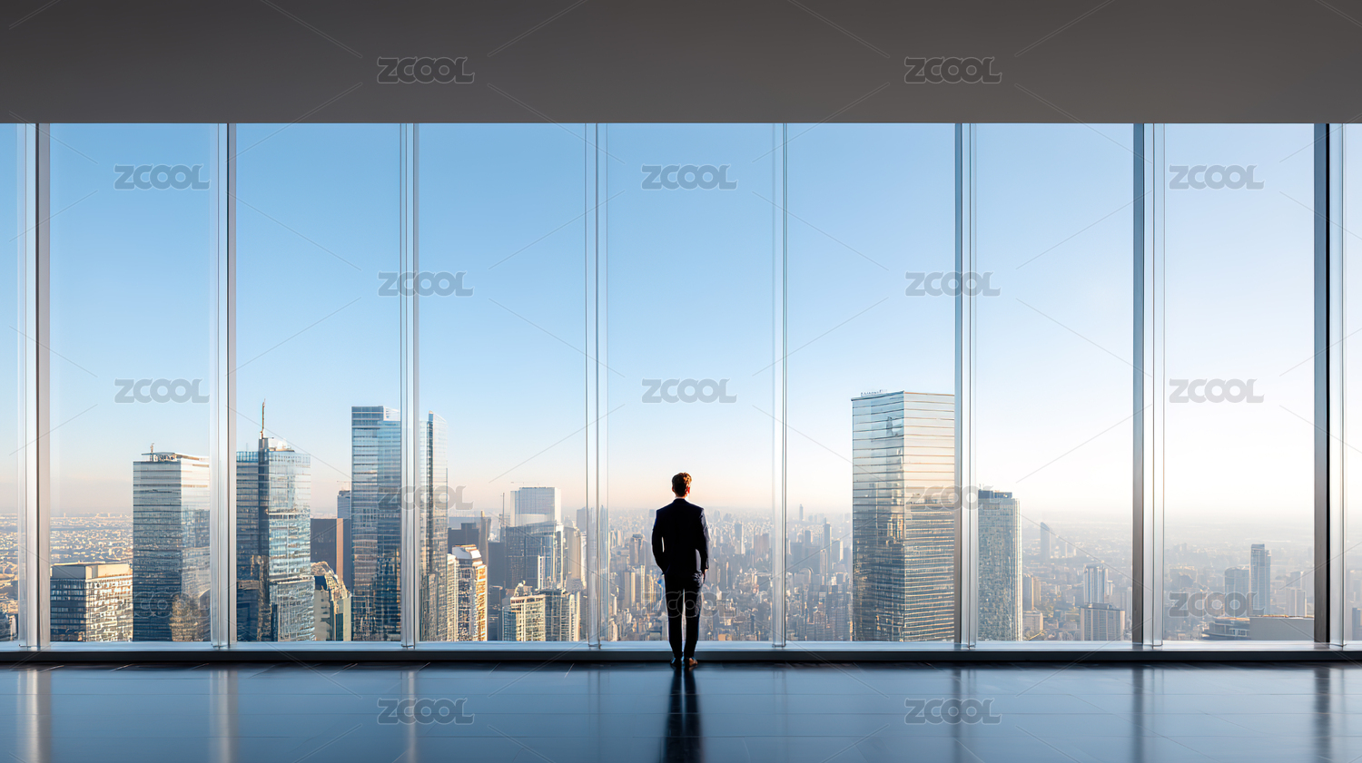 商务人士站在办公楼玻璃幕墙前凝视窗外城市