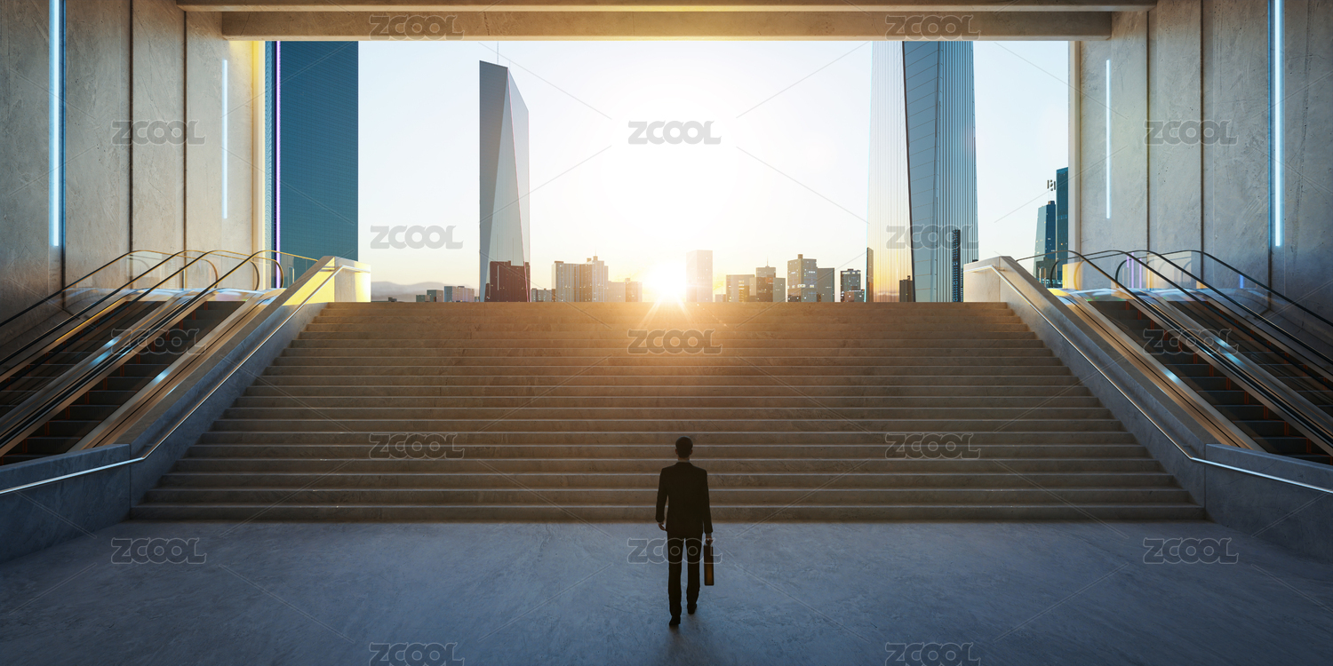 商务人士站在逆光希望成功之门前思考理财投资金融经济商业概念背影