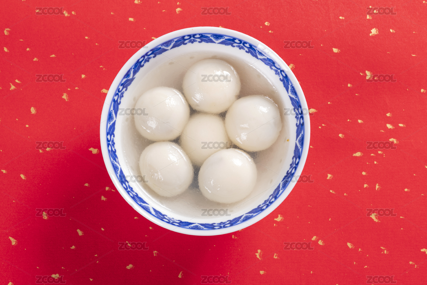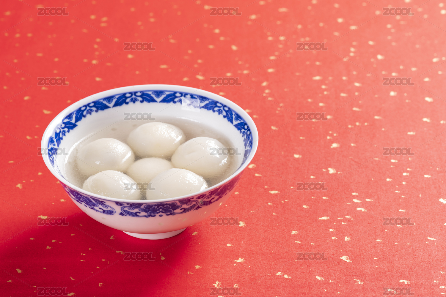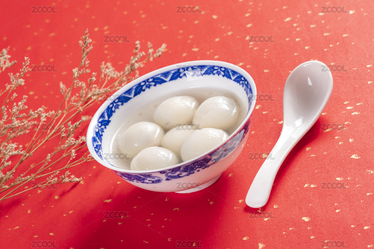 元宵节传统美食元宵汤圆盛放在青花碗中摆放在红色洒金背景上