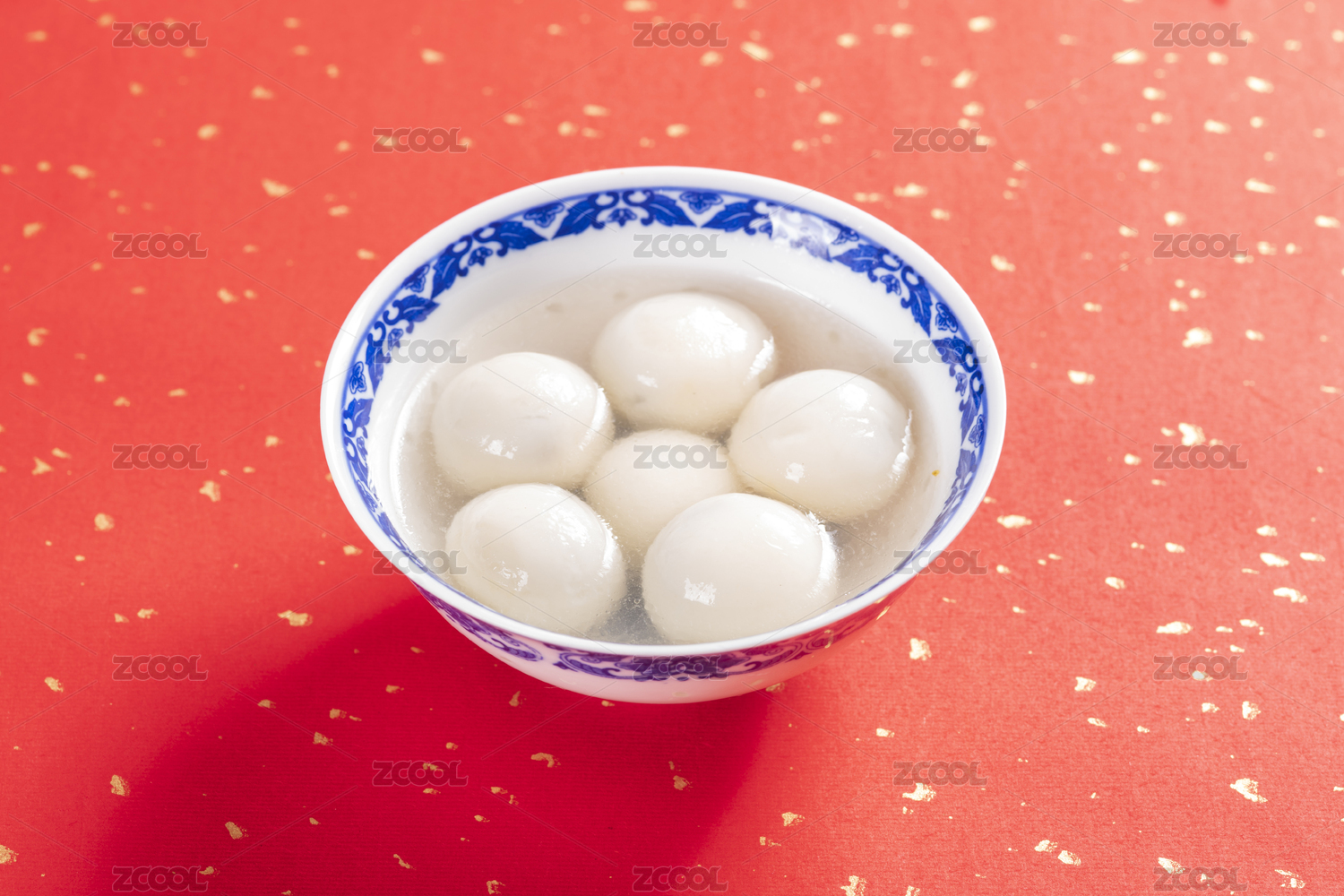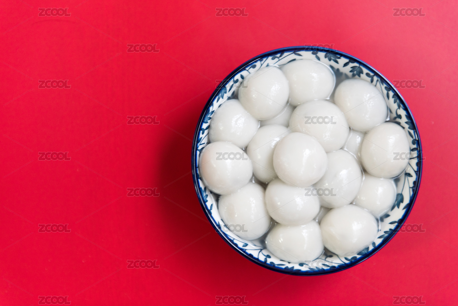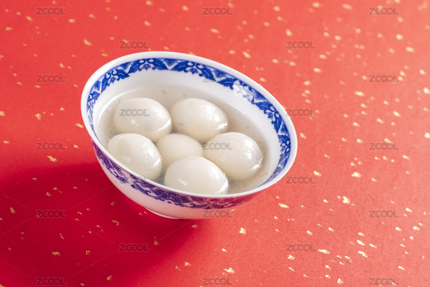 元宵节传统美食元宵汤圆盛放在青花碗中摆放在红色洒金背景上