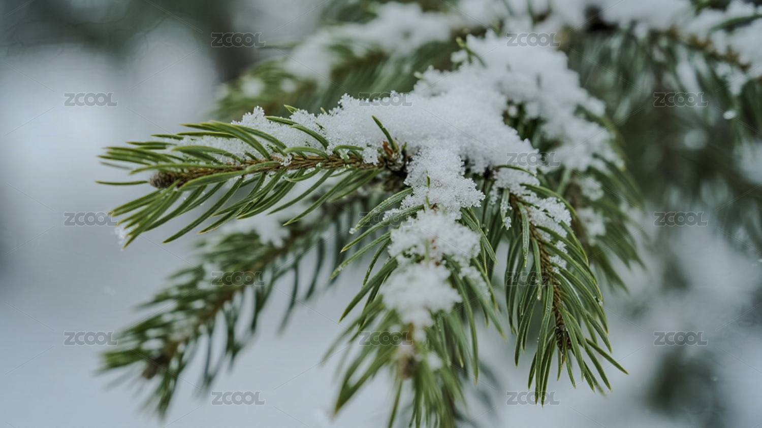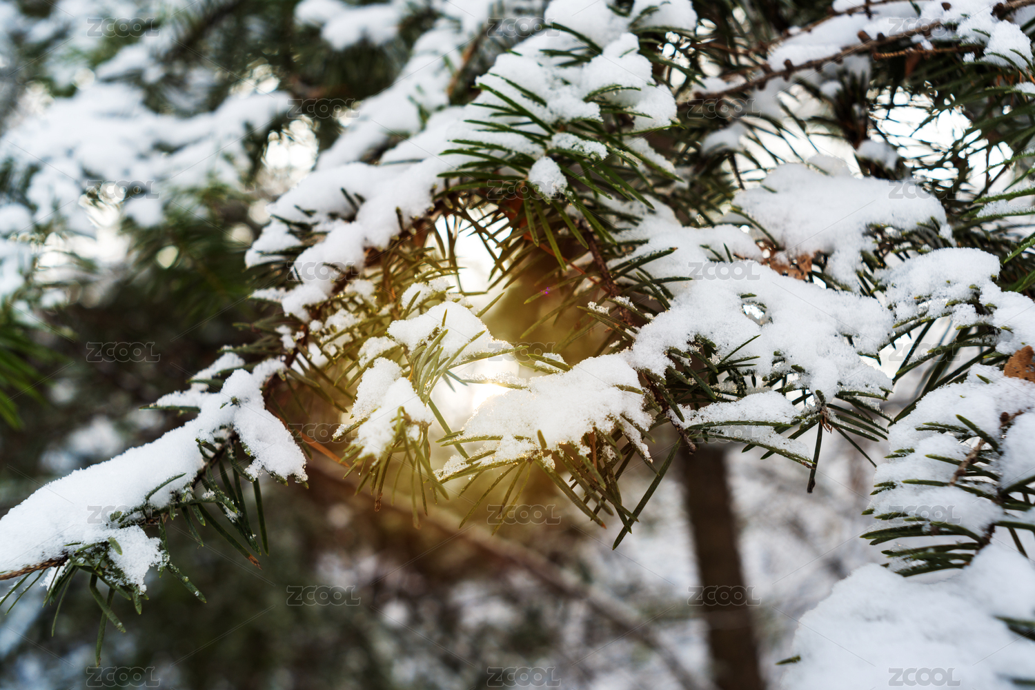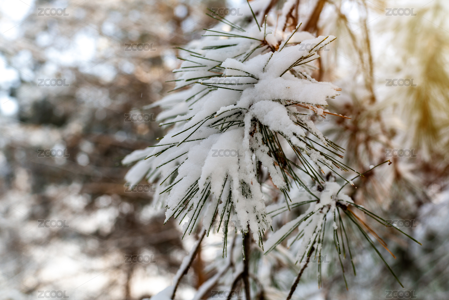 冬季下雪天树林中植物的枝叶上积满了厚厚雪