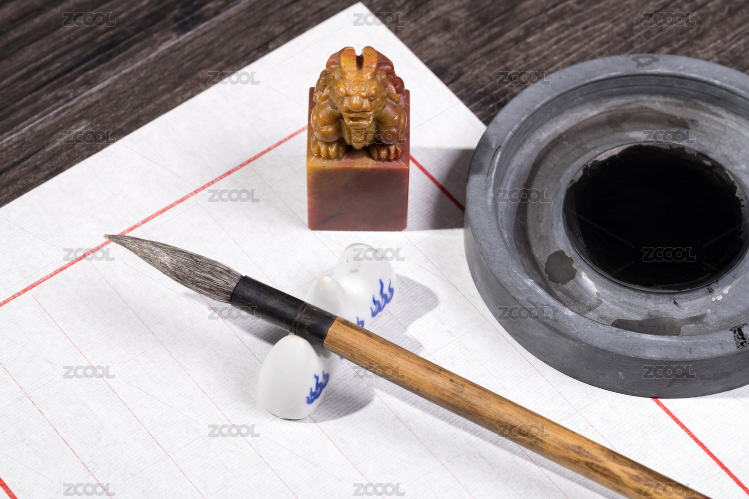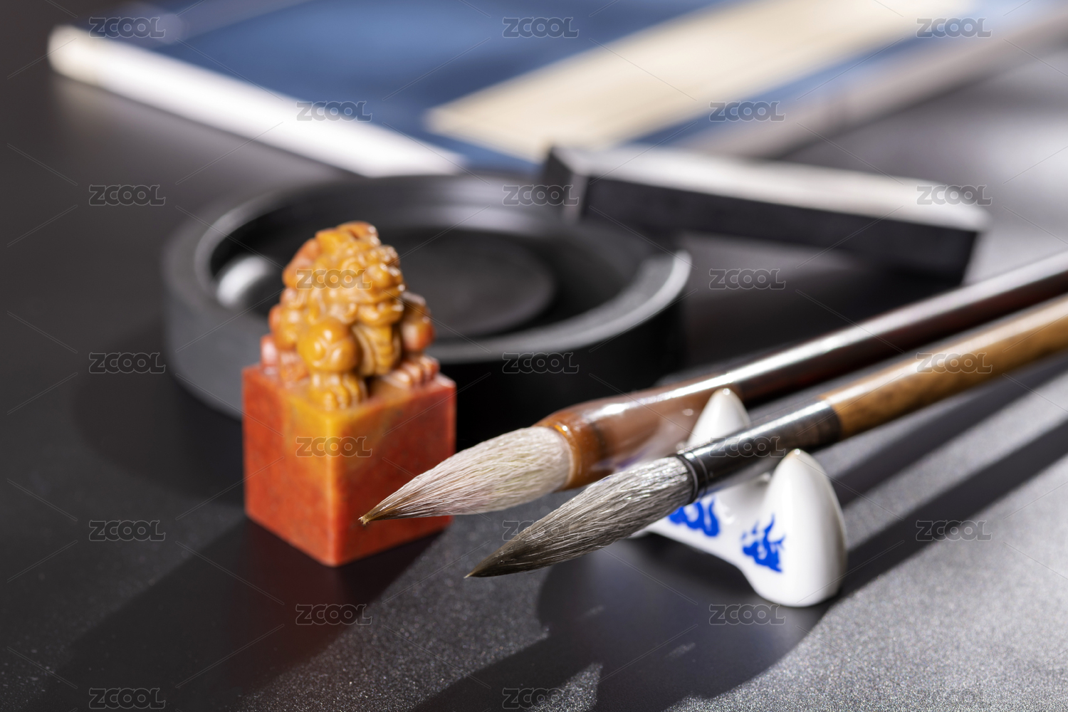 桌面上的毛笔宣纸砚台印章等文房四宝