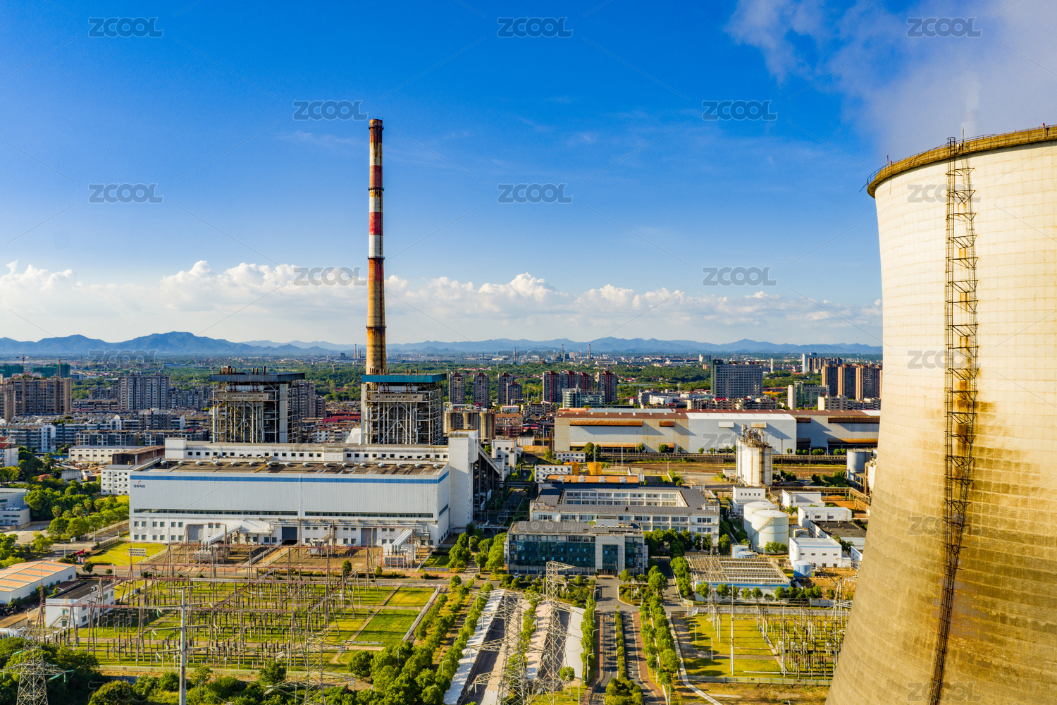 草坪环绕的发电厂烟囱正在排出浓烟