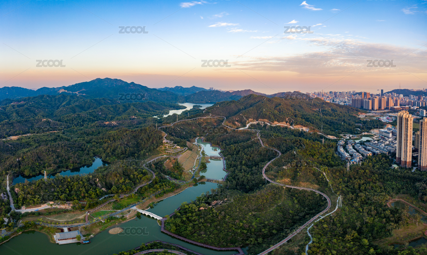 广东省珠海市香山湖公园日落航拍