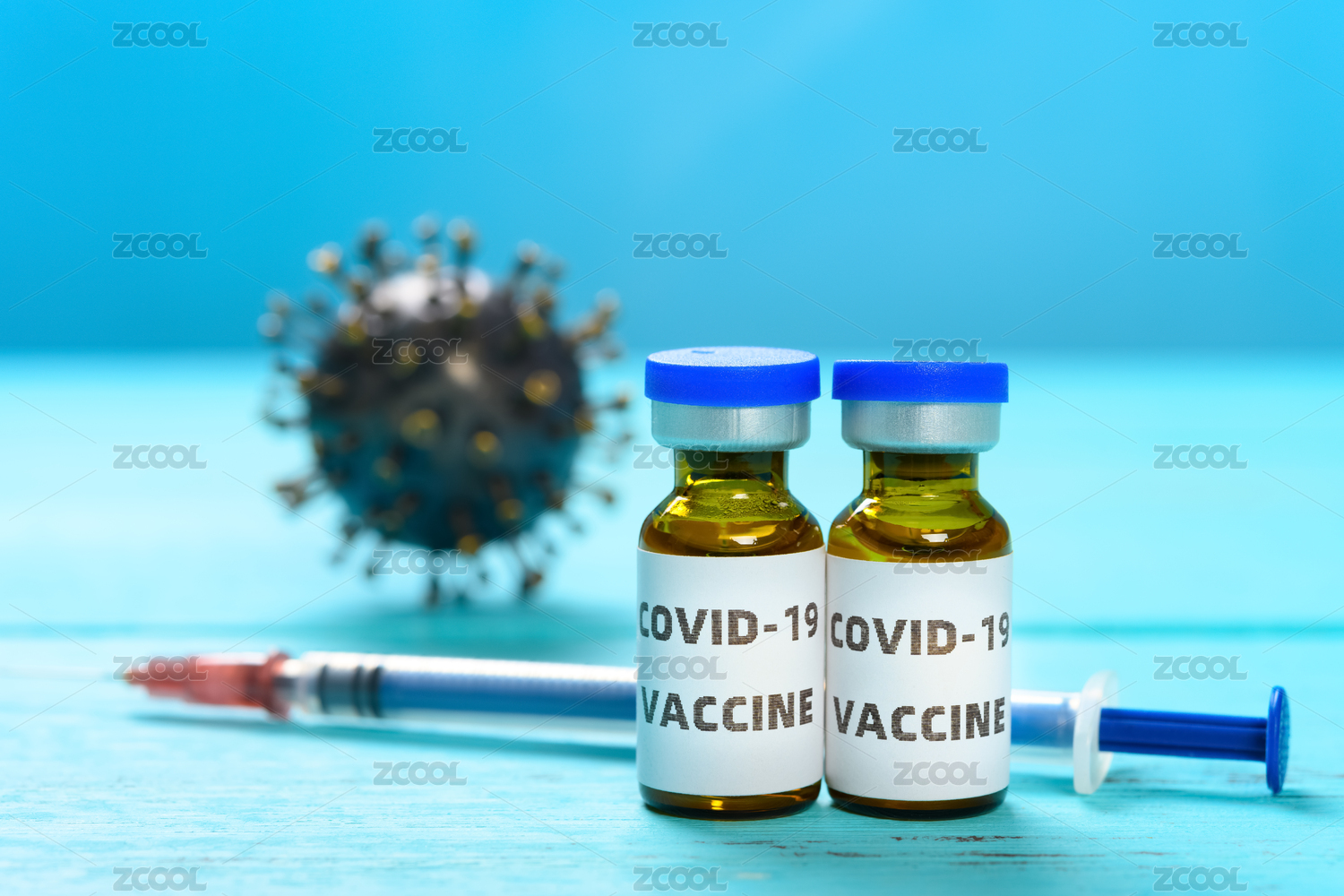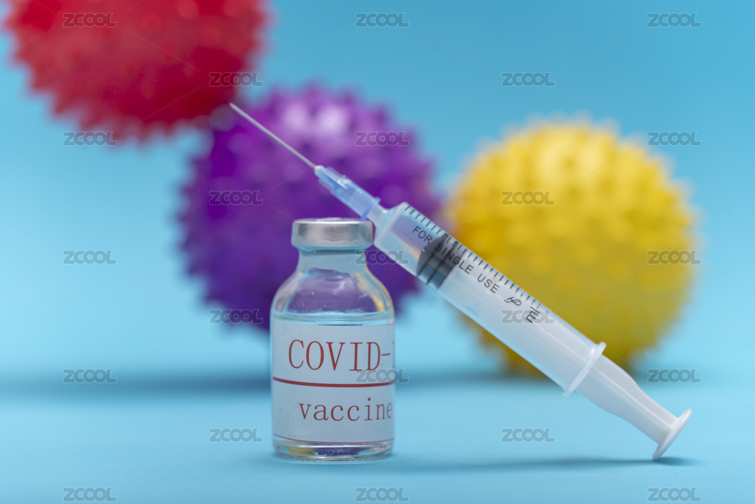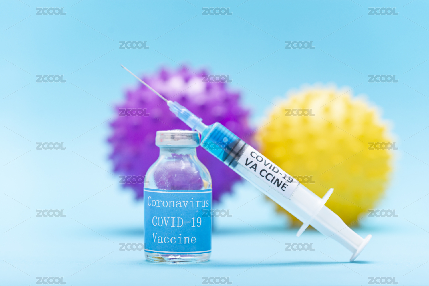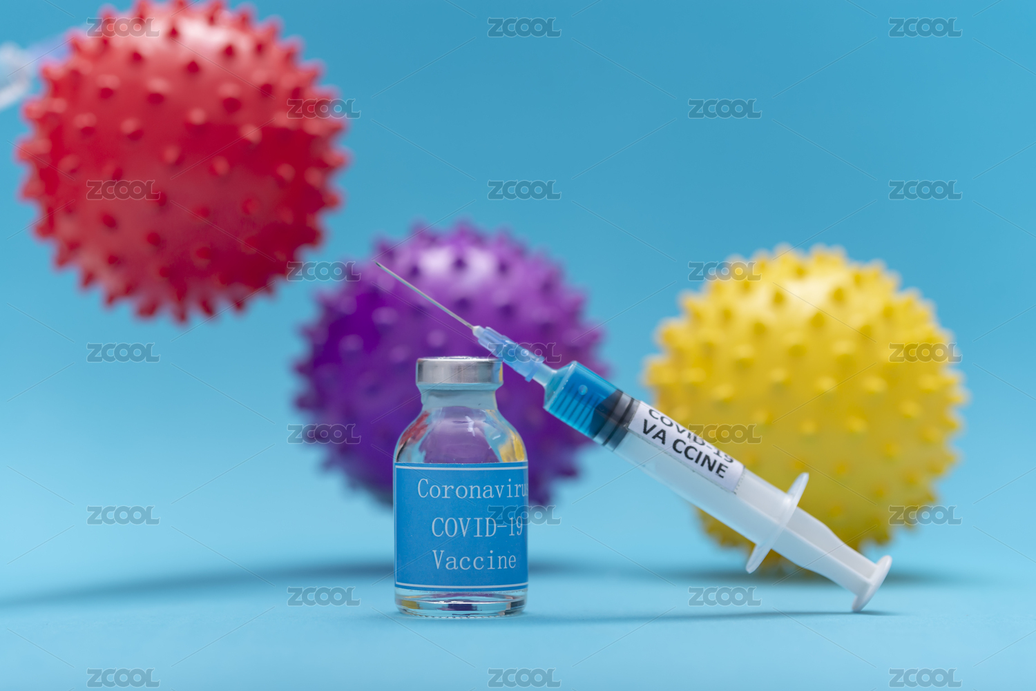 蓝底上的针筒药水及形似病毒的塑料球