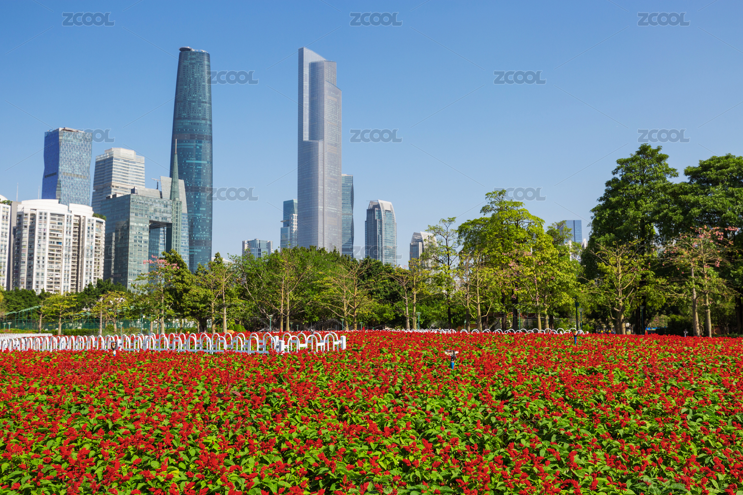 中国广州公园里的鲜花和珠江新城的摩天大楼