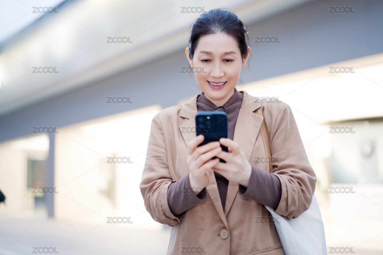 女性,智能手机,城市,商业,着装,微笑,技术,通信,现代,建筑