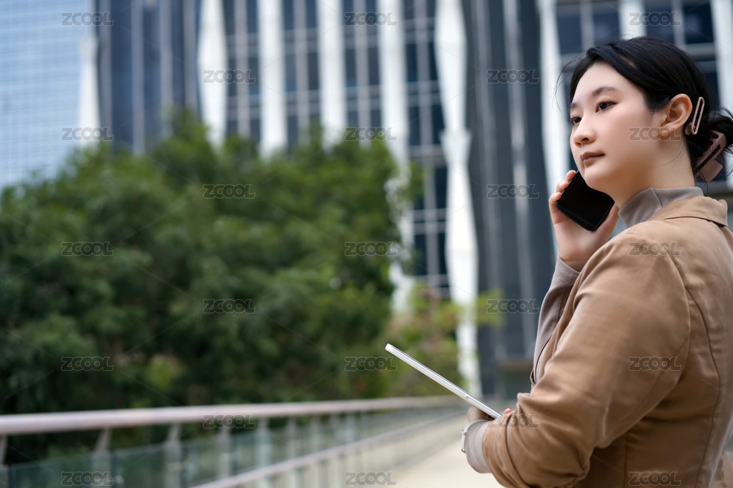 年轻的女白领在商务区使用手机