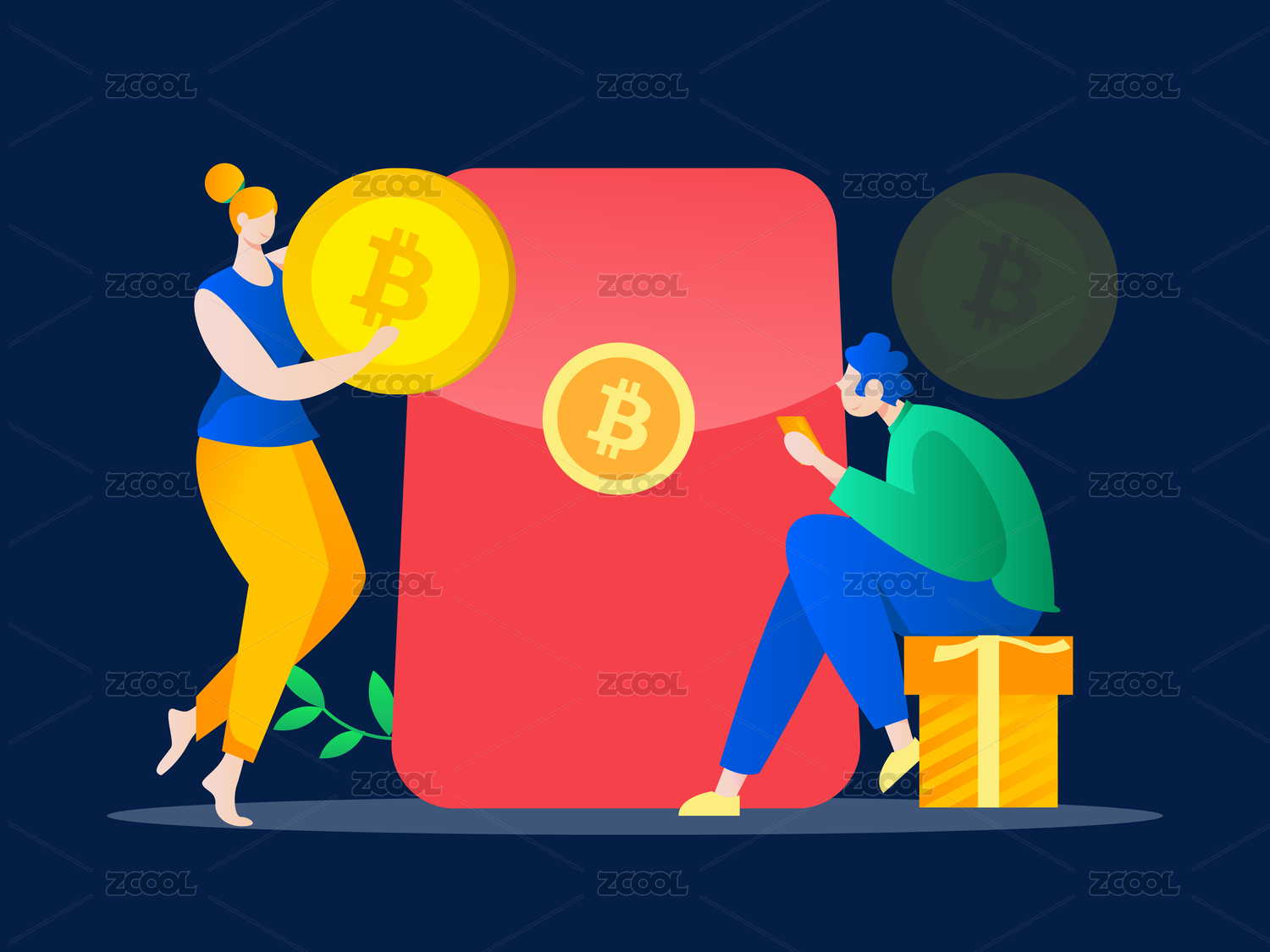 比特币理财增值男女邀请好友抢红包获取奖励矢量扁平人物插画