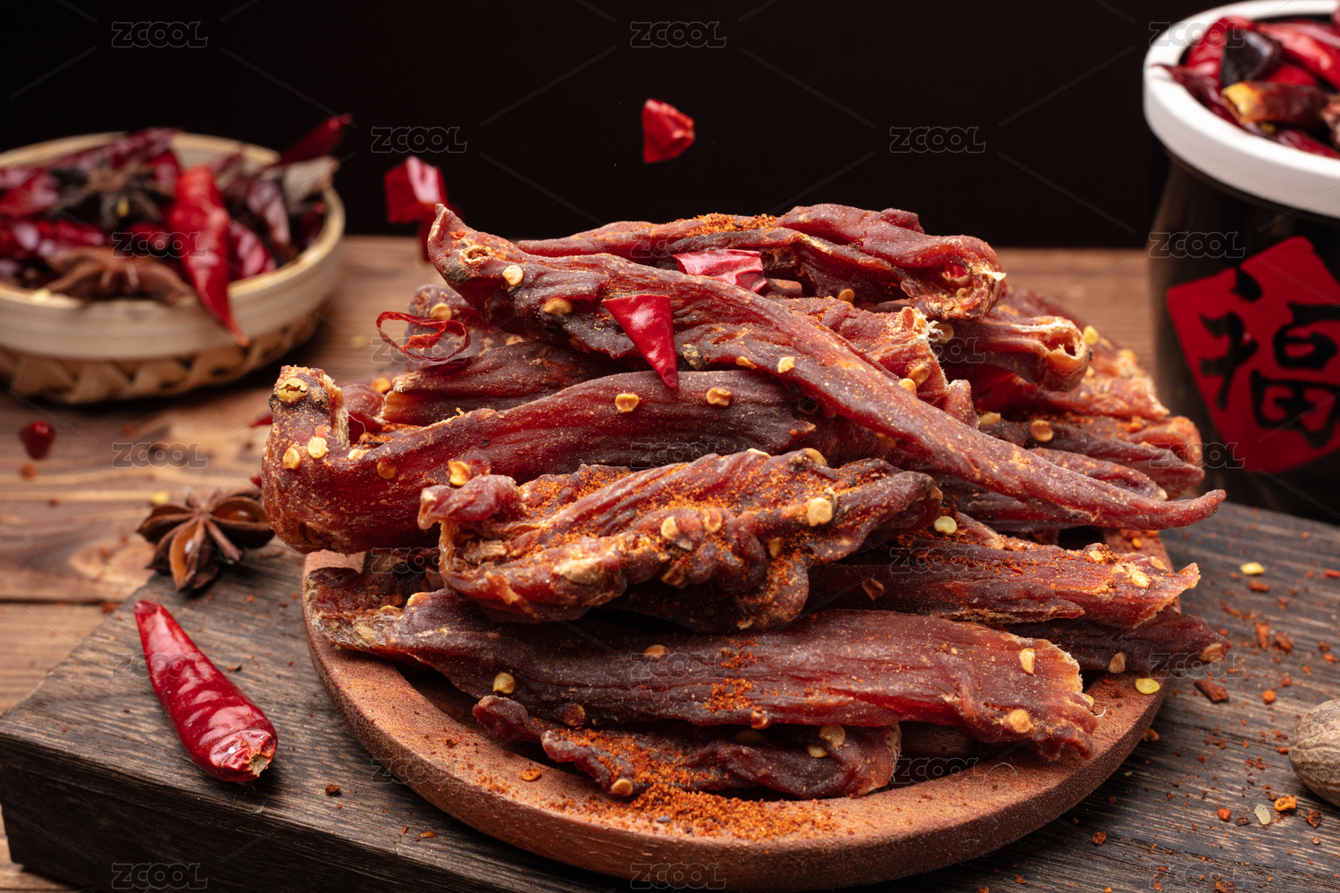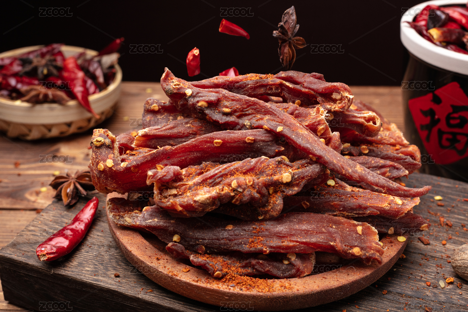 中国风场景里木盘子上装着一些麻辣鸭舌