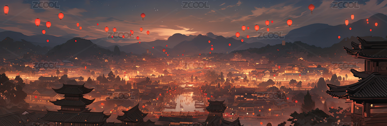户外,夜晚,光,建筑,照亮,城市,插画,节日,传统