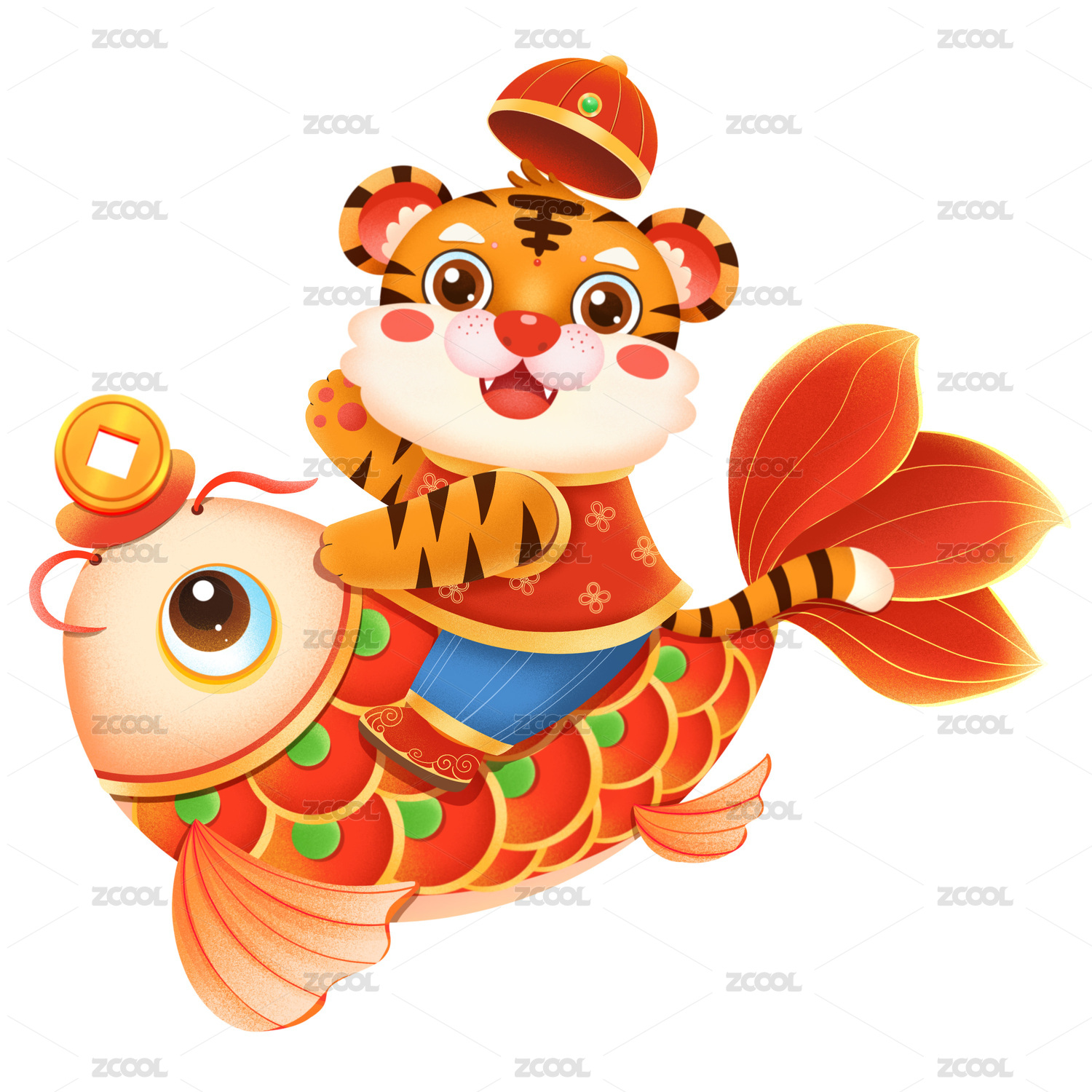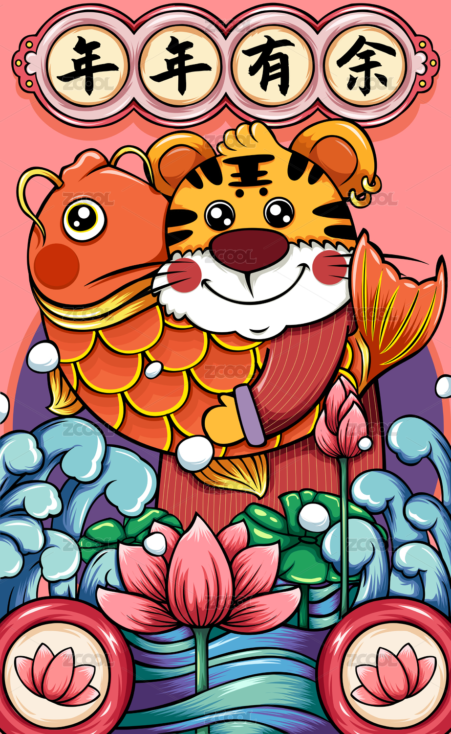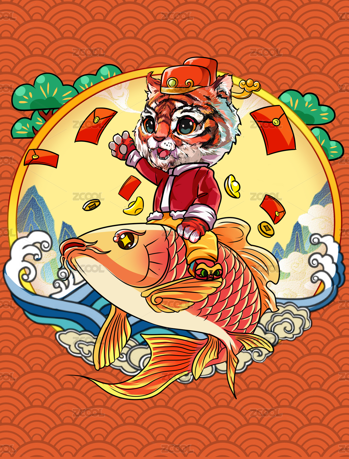 2022虎年老虎手抱大锦鲤脚踩莲花