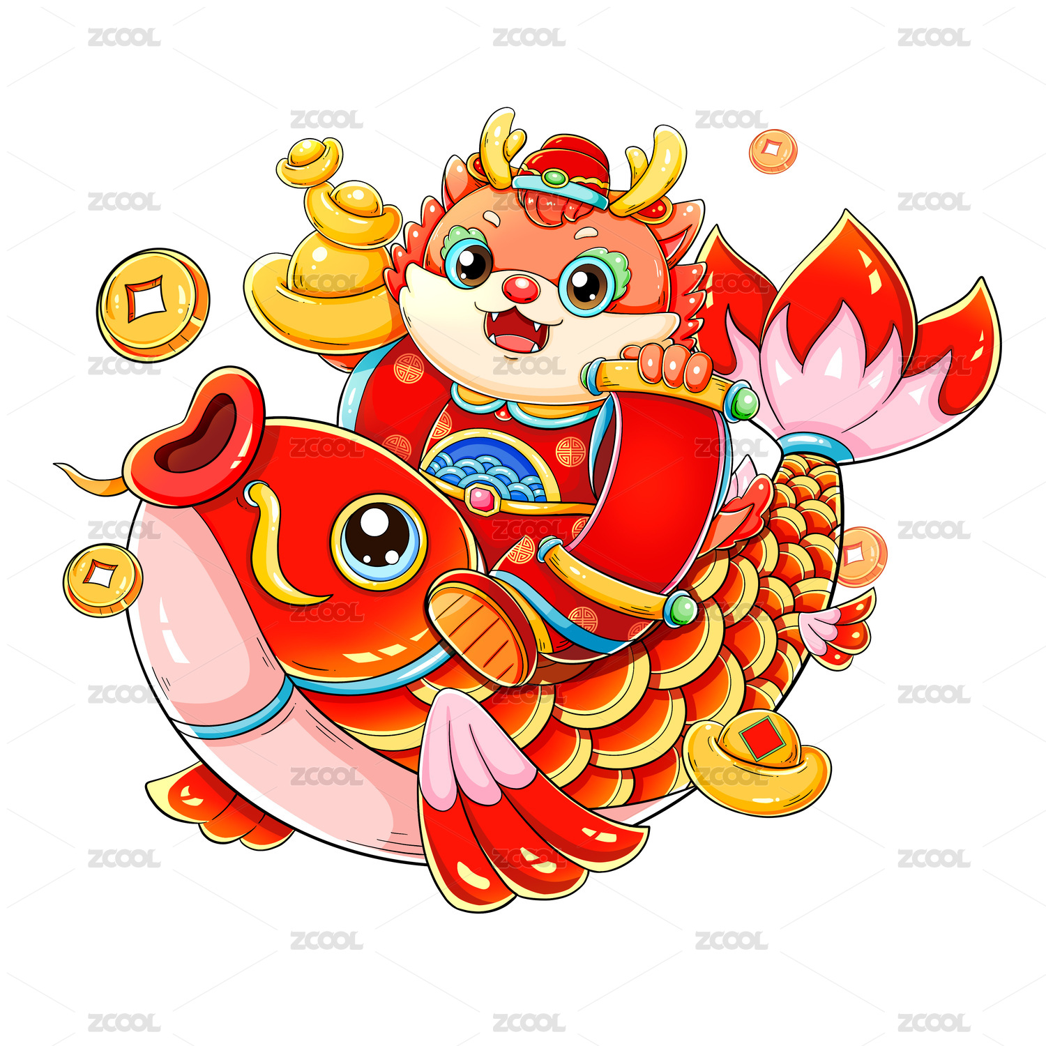 喜庆春节新年卡通锦鲤财神龙无浪插画