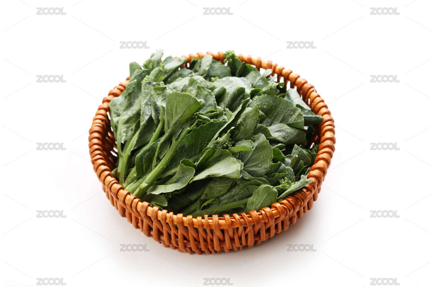 白背景上竹筛子装满新鲜的绿色蔬菜芥蓝菜心