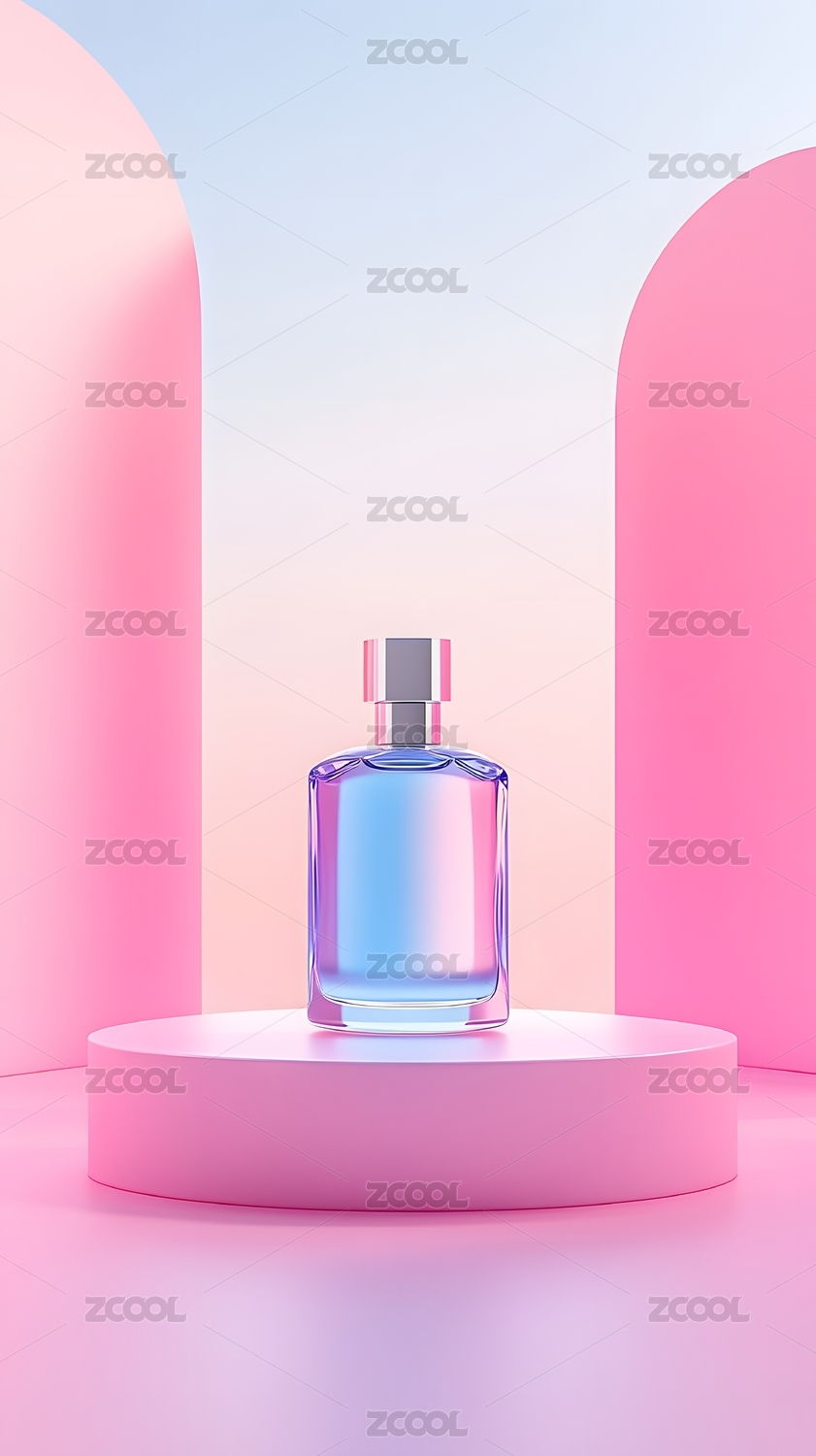 粉蓝光影下的香水瓶,呈现高端时尚感