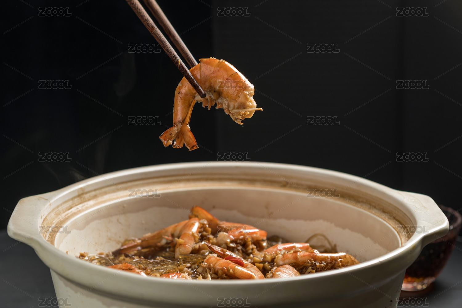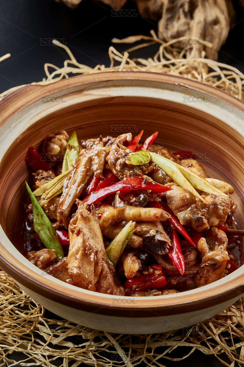 褐色砂锅装的香焖牛仔骨摆放在黑色鹅卵石上