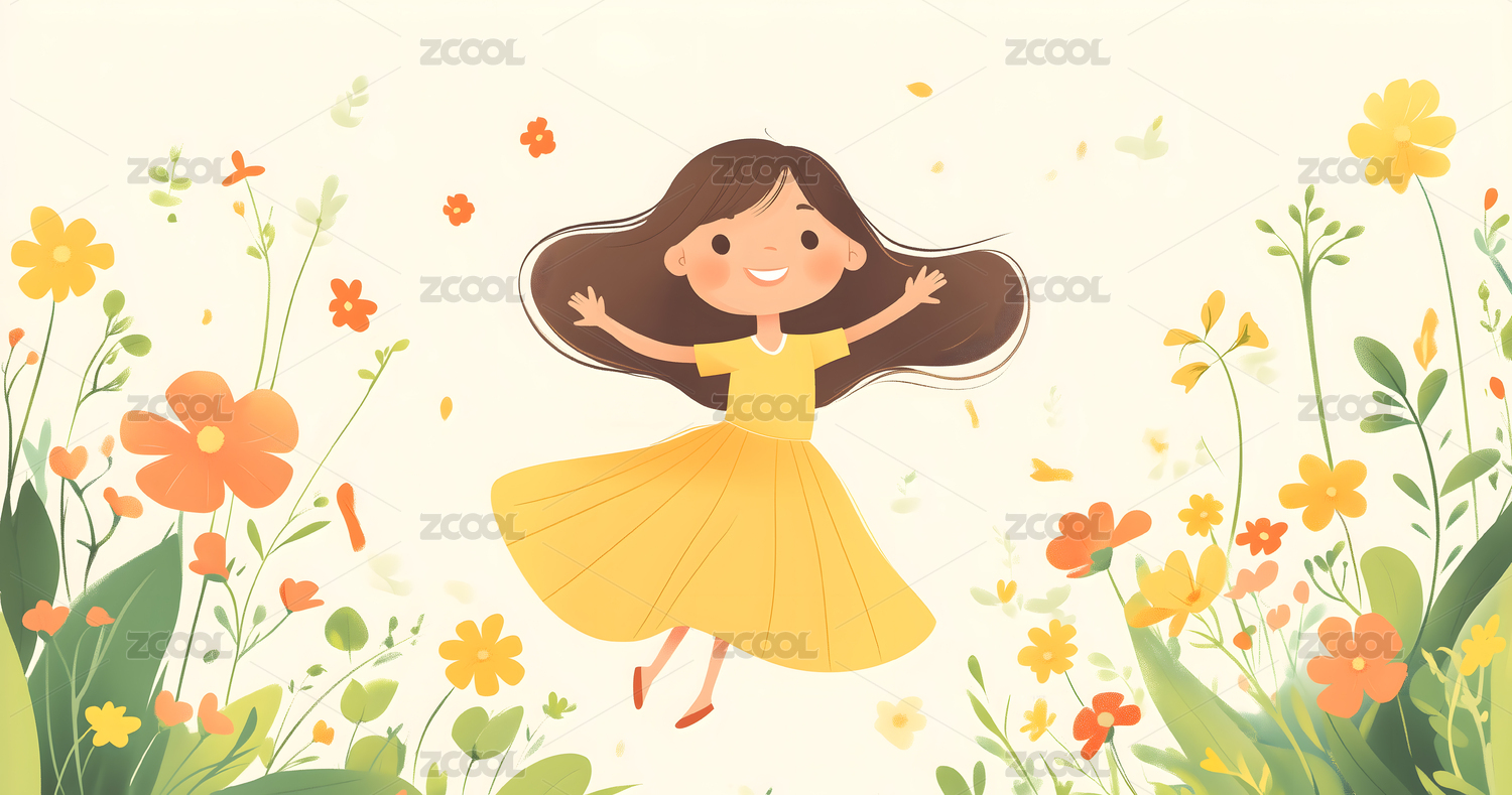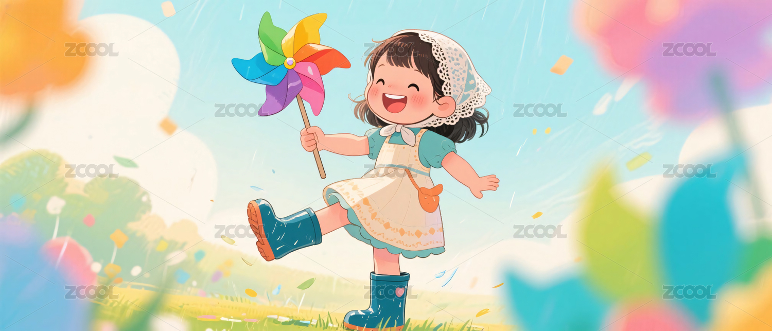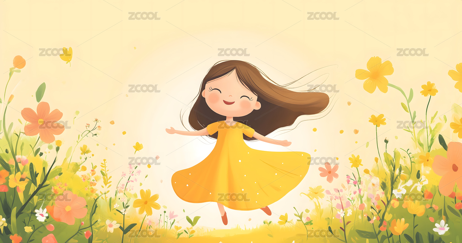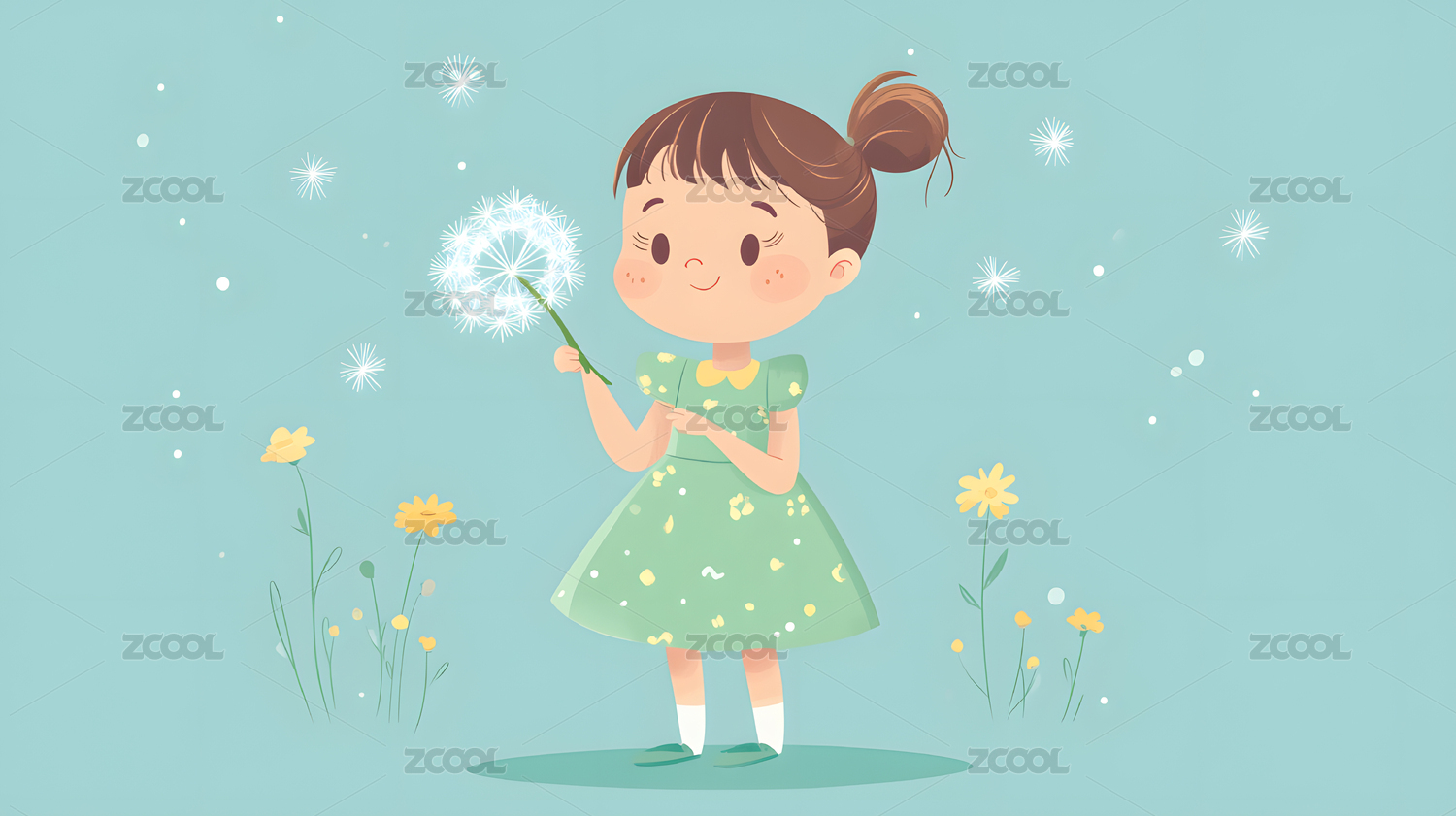 美好的春日里小女孩在山坡上吹泡泡 版绘