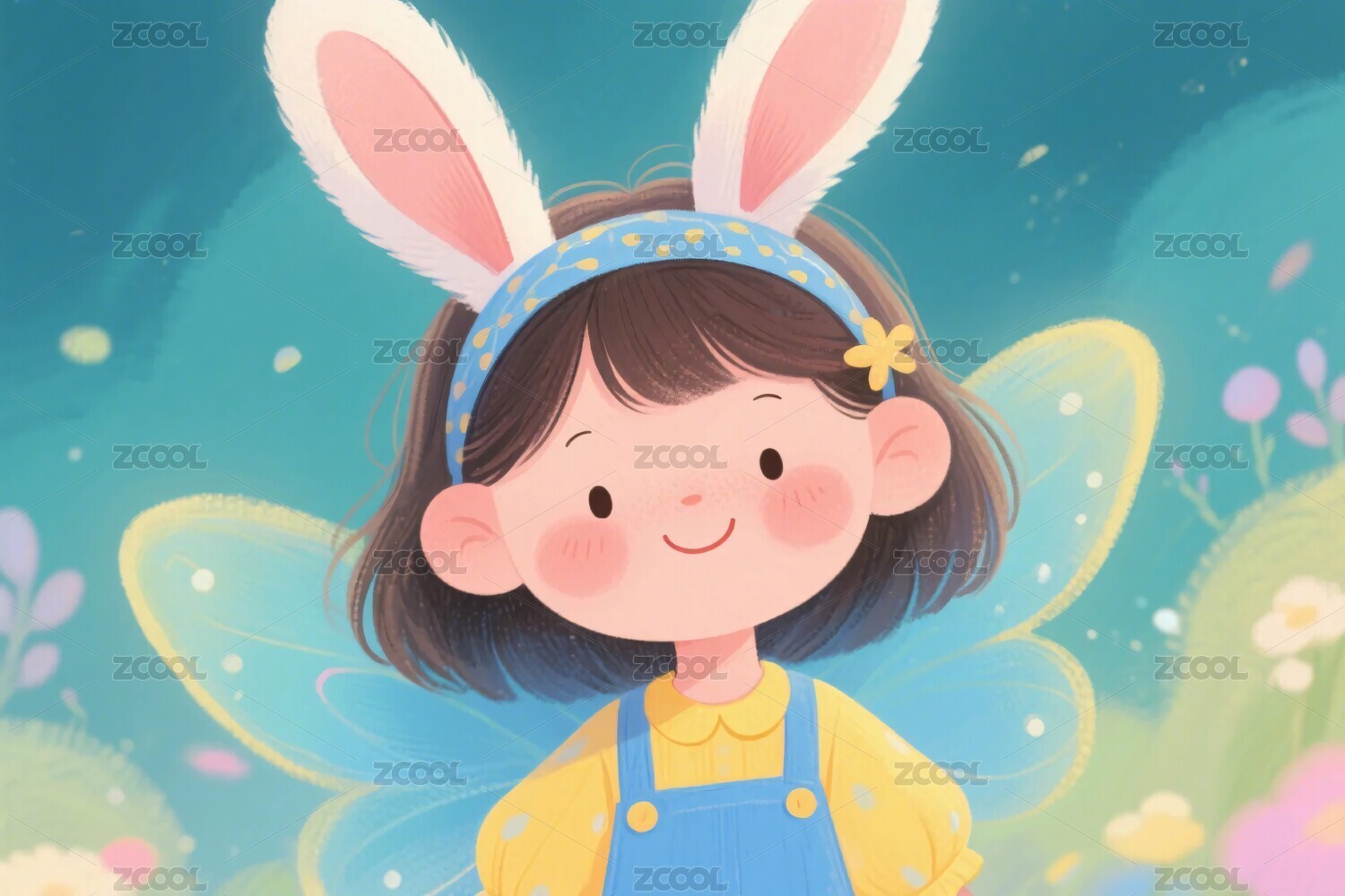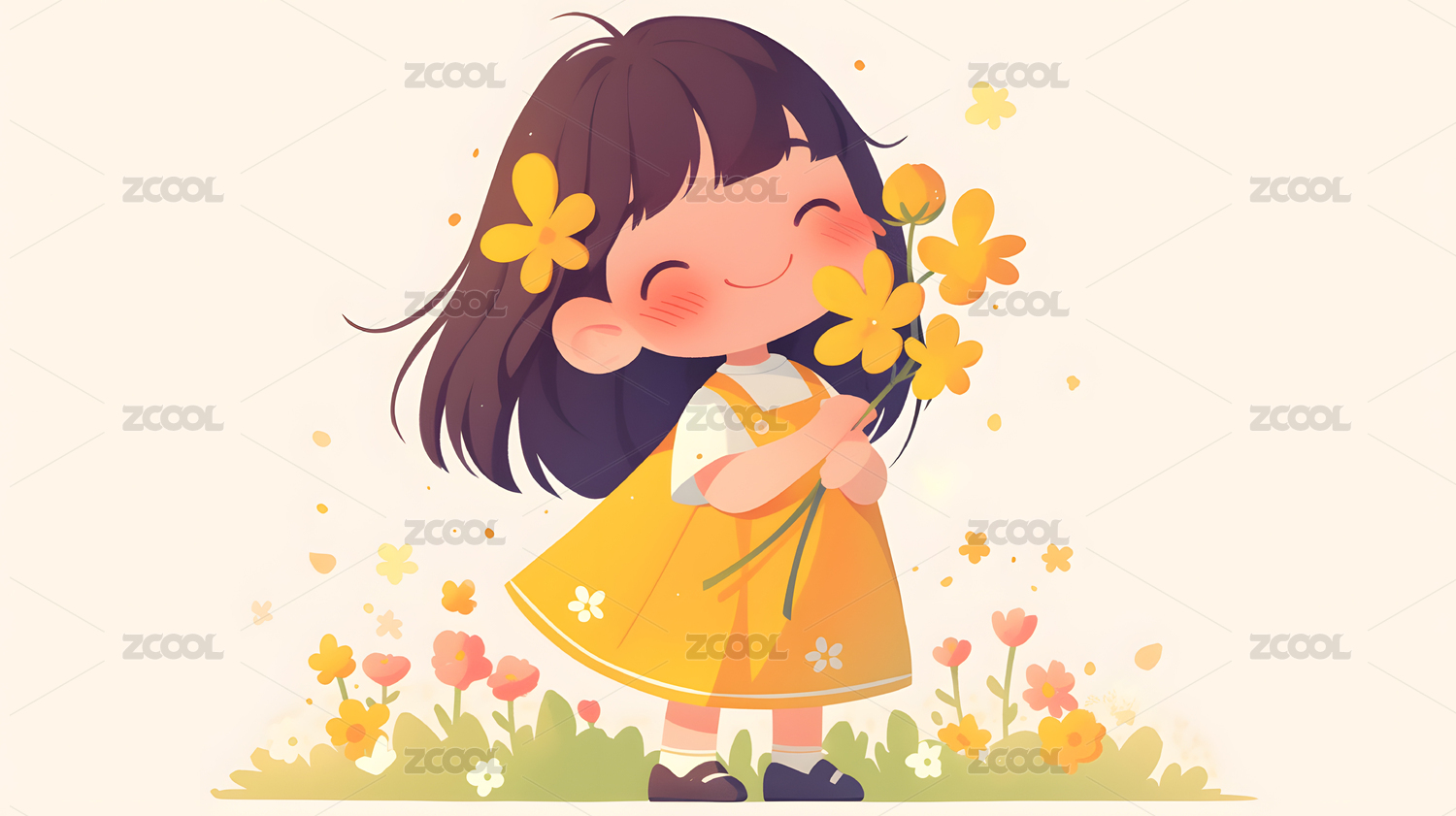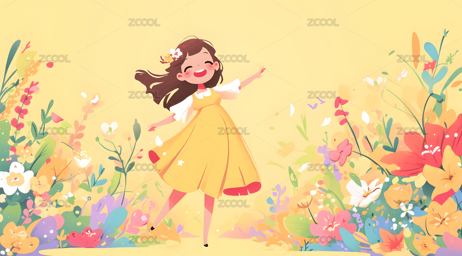 美好的春日里小女孩在山坡上吹泡泡 版绘