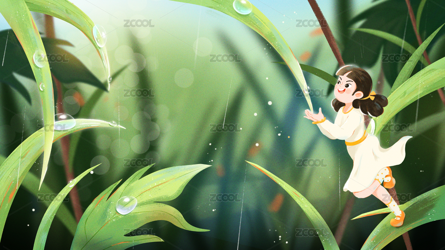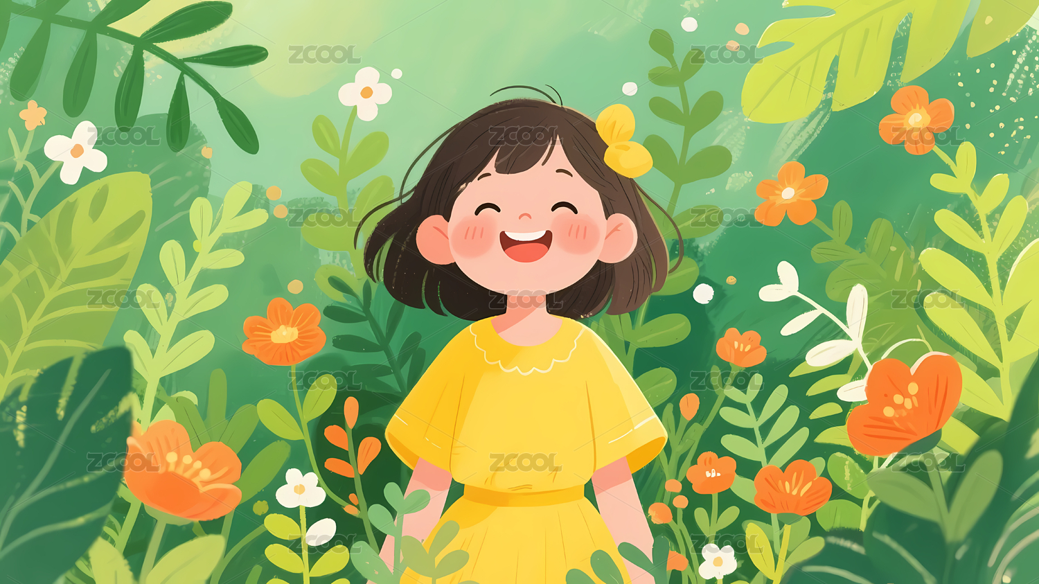 蓝色的天空背景上画着各种树叶,树叶丛中站着一位少女。