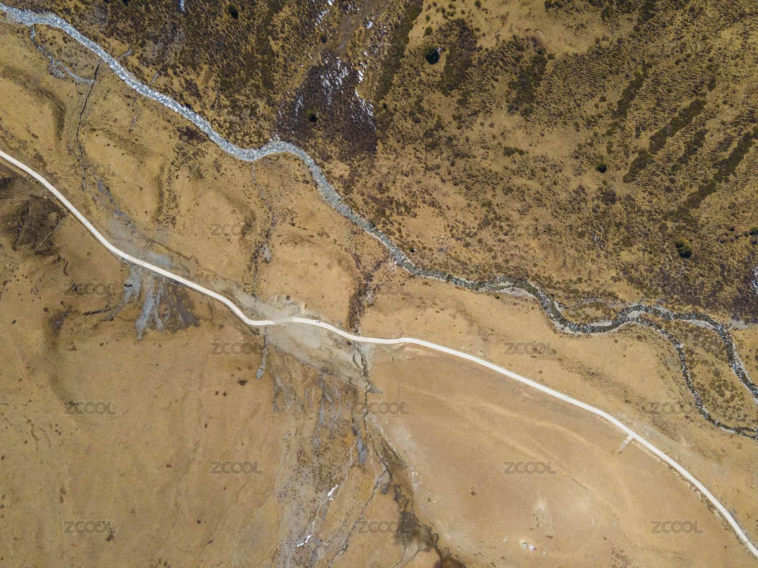 航拍初春荒滩小河